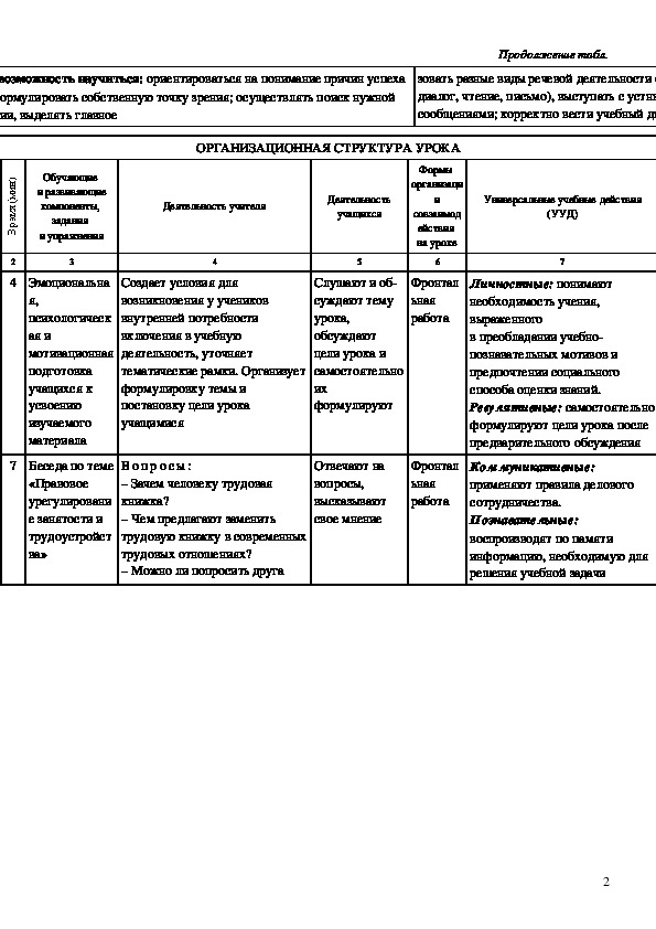 ОРГАНИЗАЦИОННАЯ СТРУКТУРА УРОКА