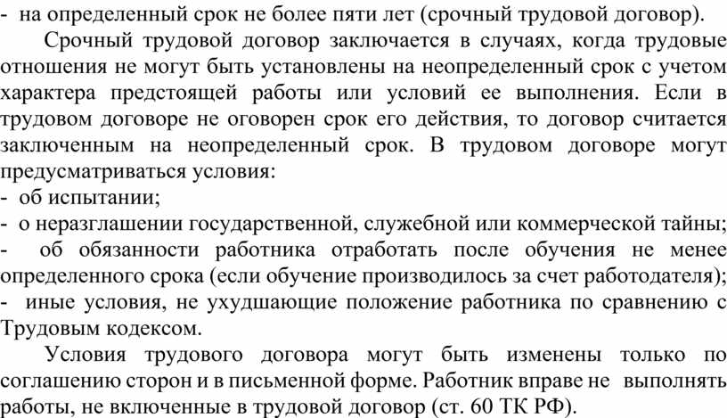 Срочный трудовой договор заключается в случаях, когда трудовые отношения не могут быть установлены на неопределенный срок с учетом характера предстоящей работы или условий ее выполнения. Если в трудовом договоре не оговорен срок его действия, то договор считается заключенным на неопределенный срок. В трудовом договоре могут предусматриваться условия: