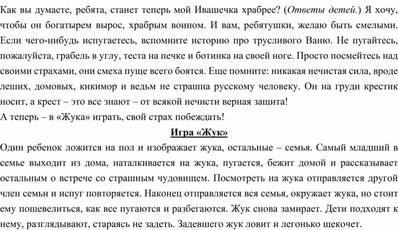 Цель: Познакомить со сказками о нечистой силе и с рассказом К.Д. Ушинского «Трусливый Ваня». Учить одолевать страх, верить в помощь креста, смеяться над своей трусостью. Поиграть в шуточную народную игру «Жук», юмор которой поможет детям бороться со страхами.