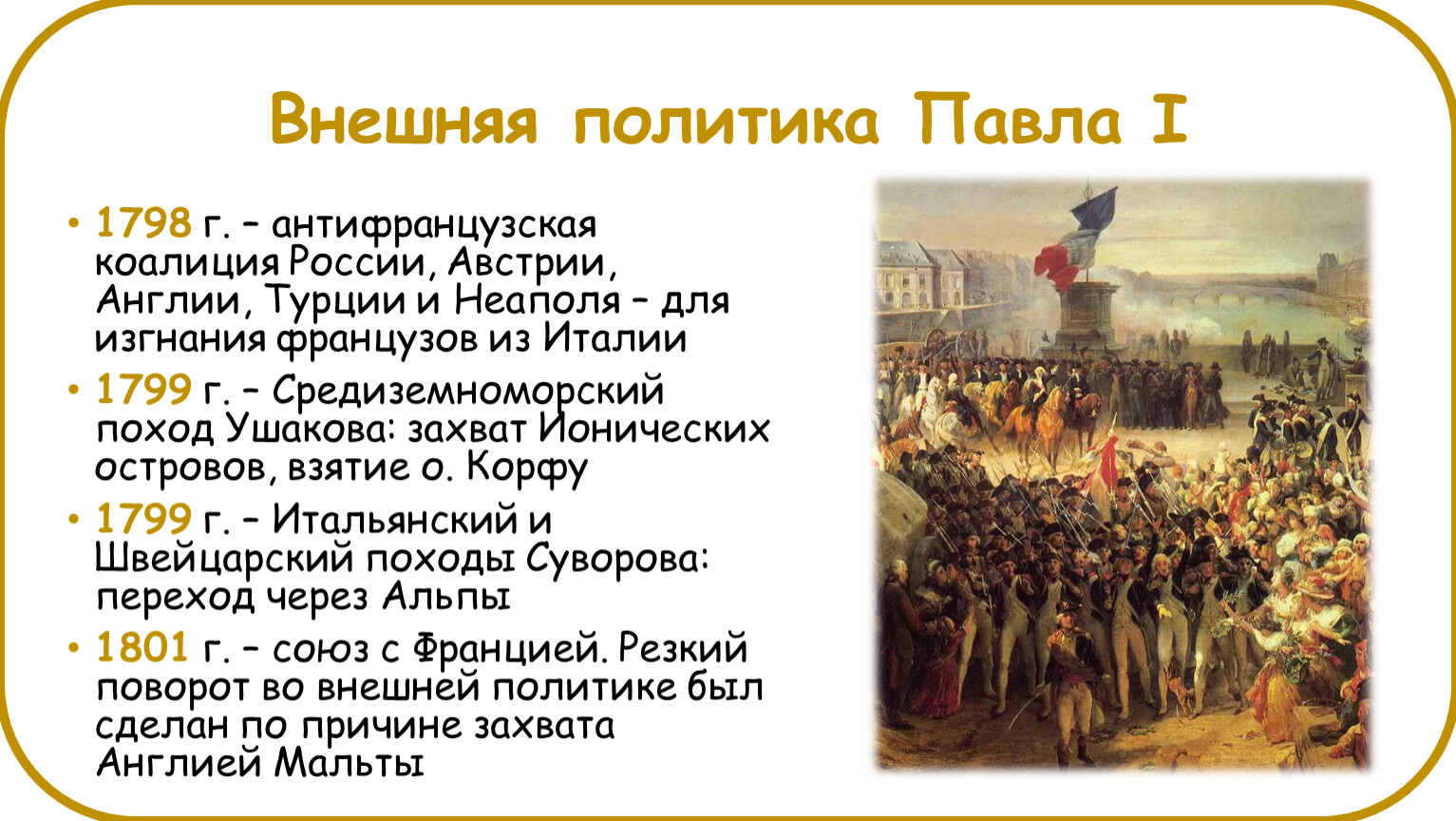 1801 г. – союз с Францией. Резкий поворот во внешней политике был сделан по причине захвата Англией Мальты