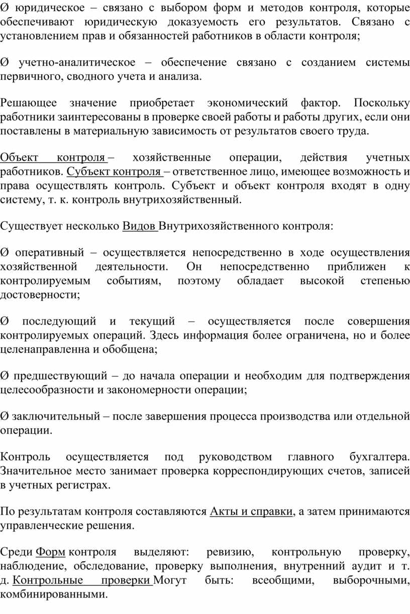 Ø юридическое – связано с выбором форм и методов контроля, которые обеспечивают юридическую доказуемость его результатов. Связано с установлением прав и обязанностей работников в области контроля;
