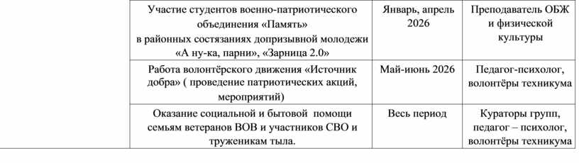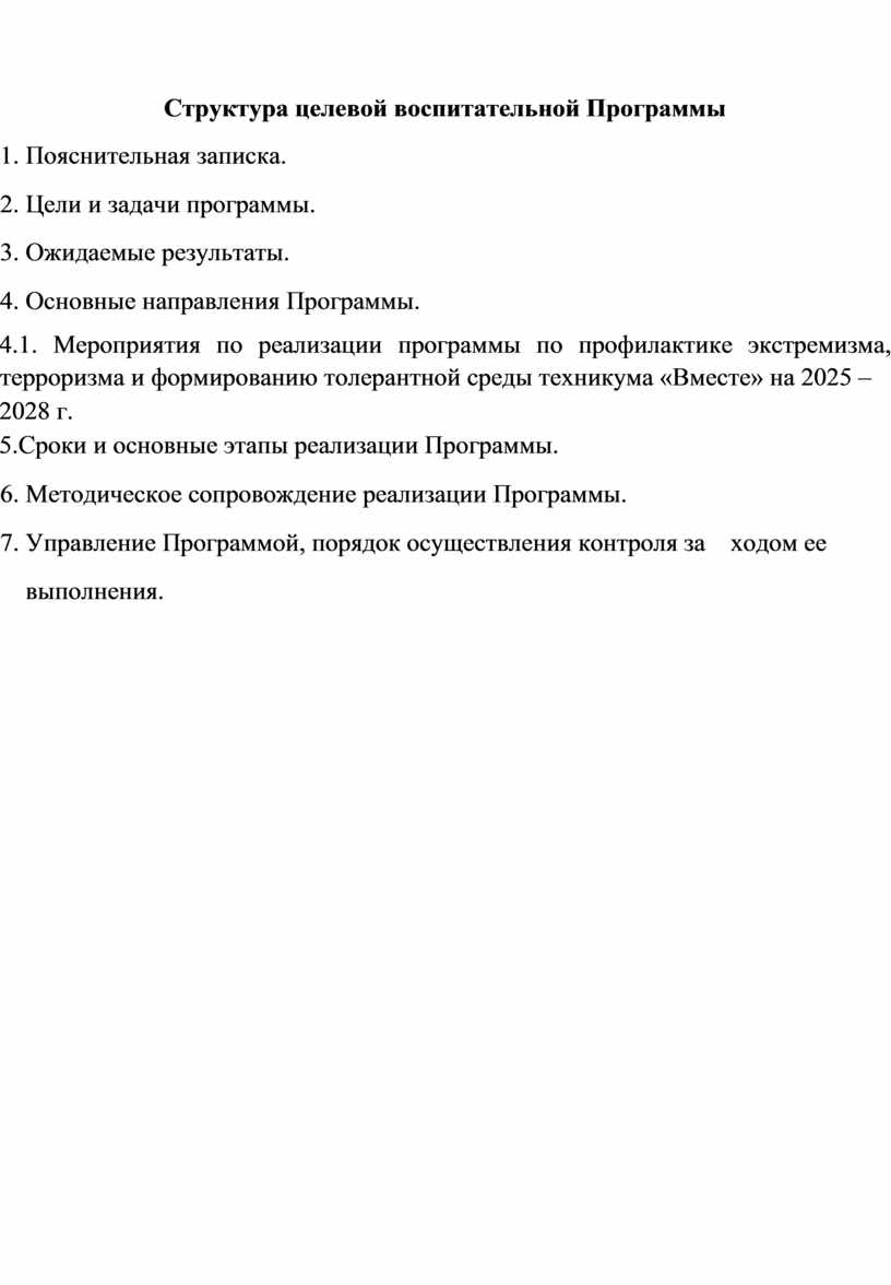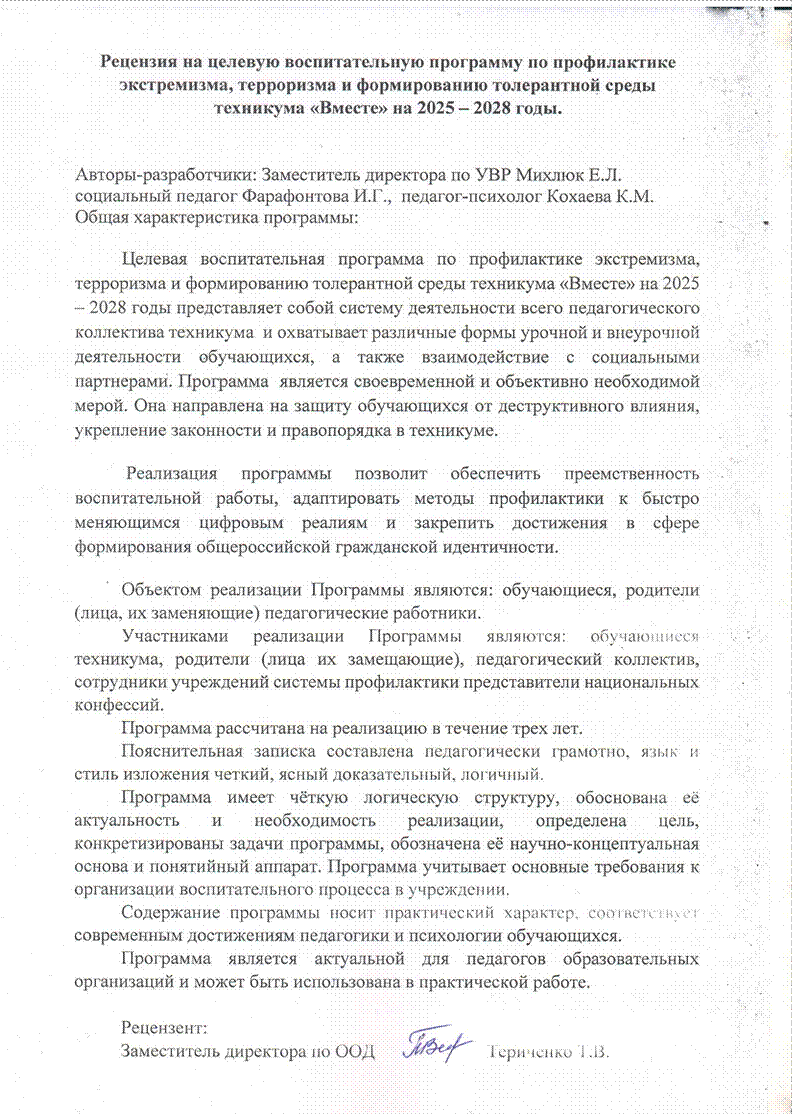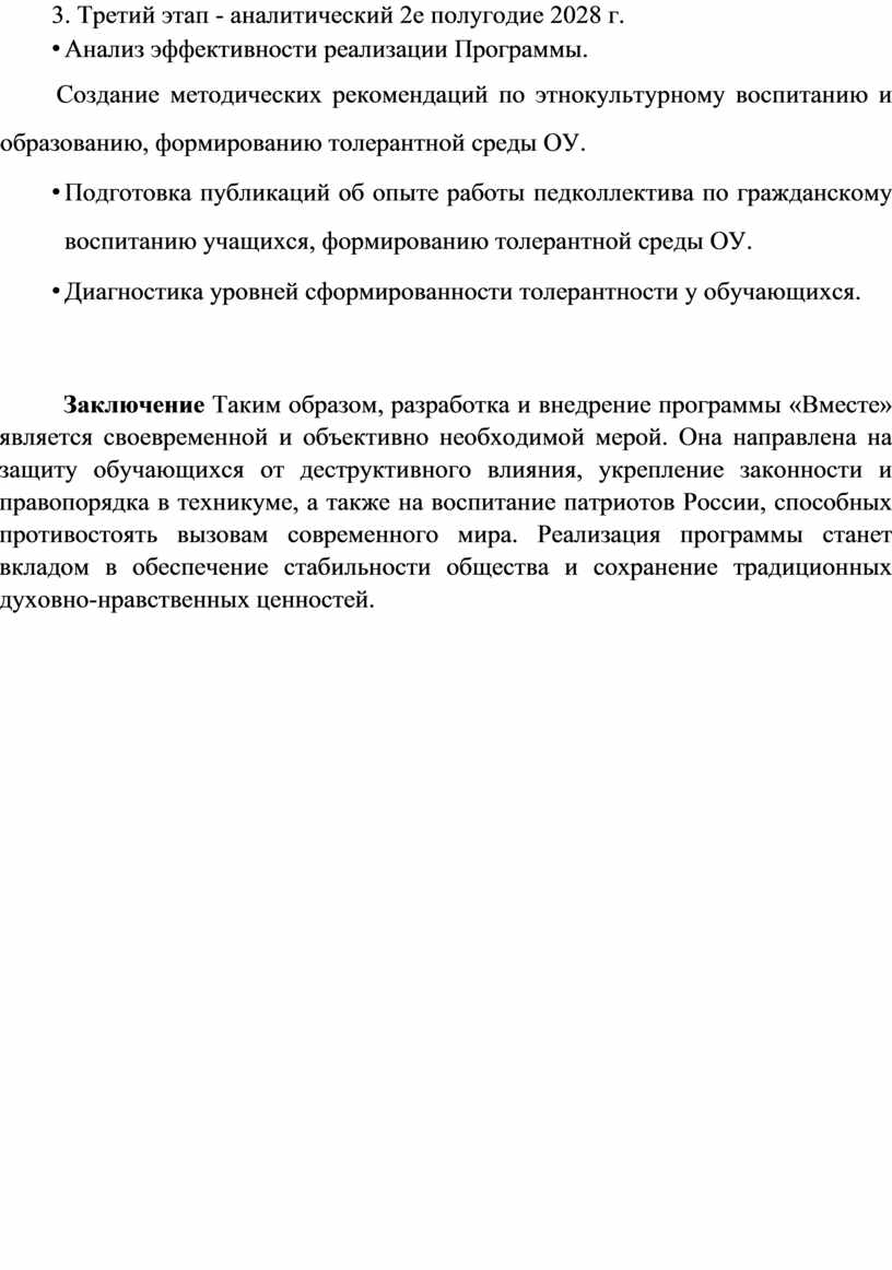 Заключение Таким образом, разработка и внедрение программы «Вместе» является своевременной и объективно необходимой мерой. Она направлена на защиту обучающихся от деструктивного влияния, укрепление законности и правопорядка в техникуме, а также на воспитание патриотов России, способных противостоять вызовам современного мира. Реализация программы станет вкладом в обеспечение стабильности общества и сохранение традиционных духовно-нравственных ценностей.