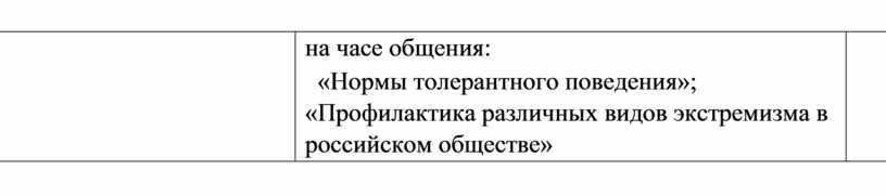6. Включение в проведении родительского всеобуча вопросов: «Воспитание толерантного человека», «Будьте бдительны. Экстремизм и молодежь», «Организация занятости ребенка во внеурочное время с целью недопущения их участия в деструктивных группах и сообществах.
