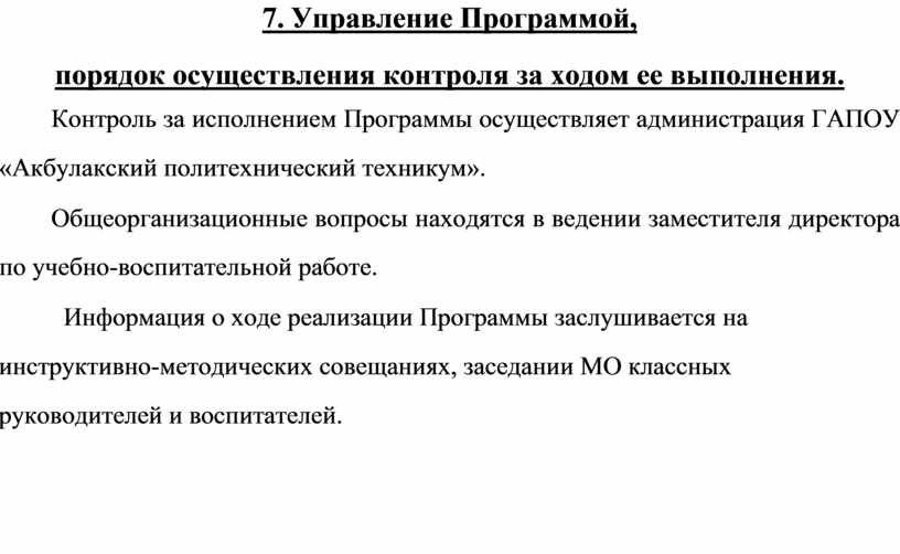 7. Управление Программой, порядок осуществления контроля за ходом ее выполнения.