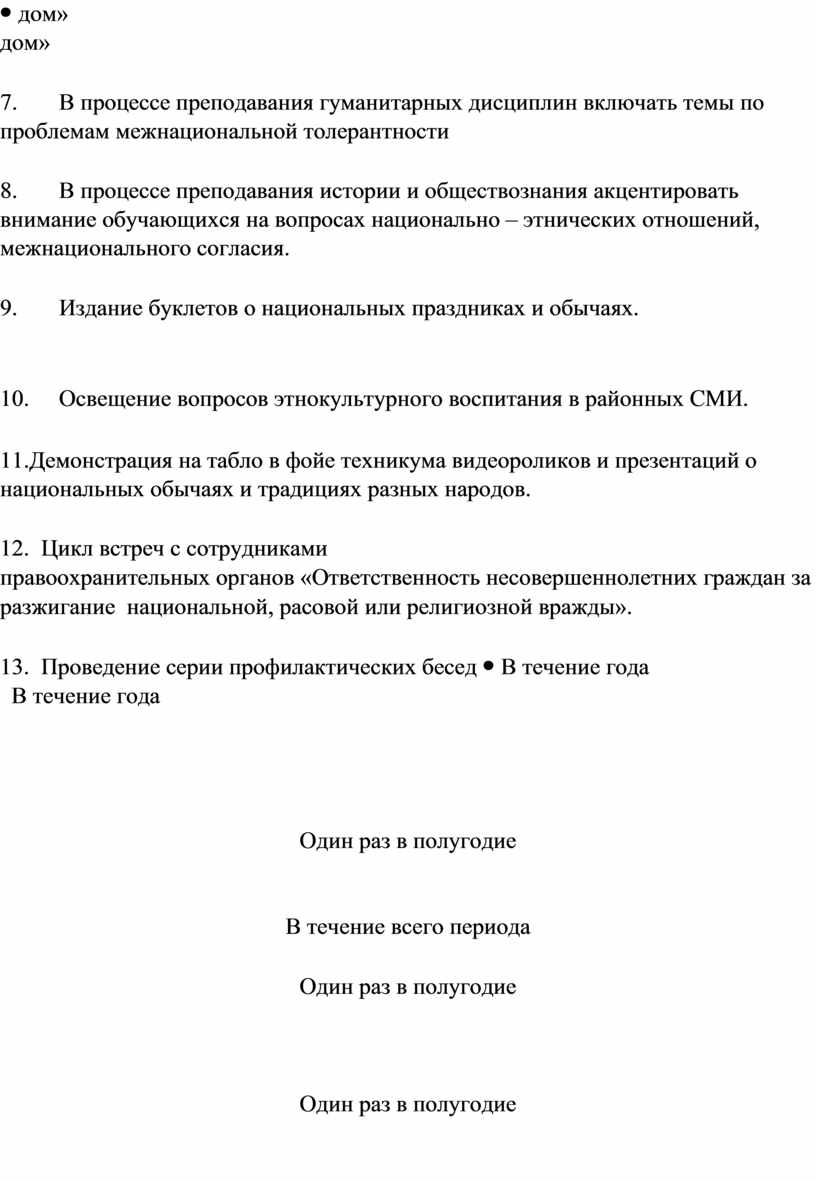 1.Разработать систему диагностических материалов по выявлению уровня толерантных свойств учащихся; по определению уровня взаимоотношений среди учащихся в коллективе личности; по выявлению участия студентов в организациях, осуществляющих социально – негативную деятельность.
