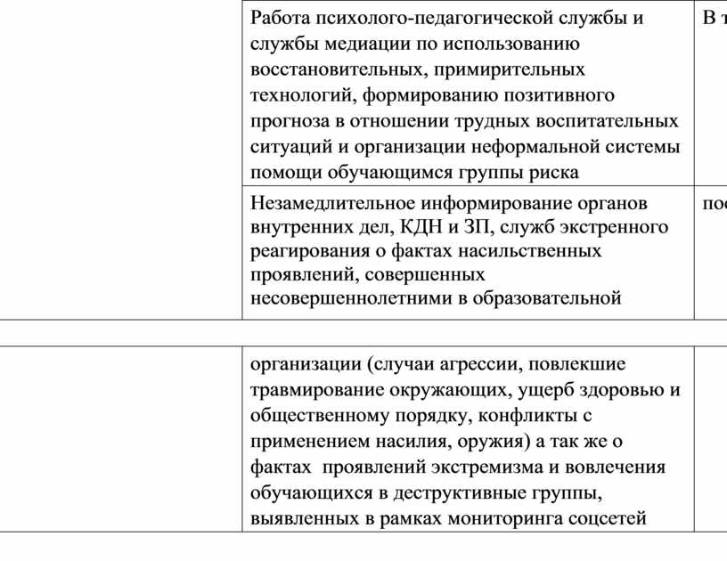 Незамедлительное информирование органов внутренних дел, КДН и ЗП, служб экстренного реагирования о фактах насильственных проявлений, совершенных несовершеннолетними в образовательной |