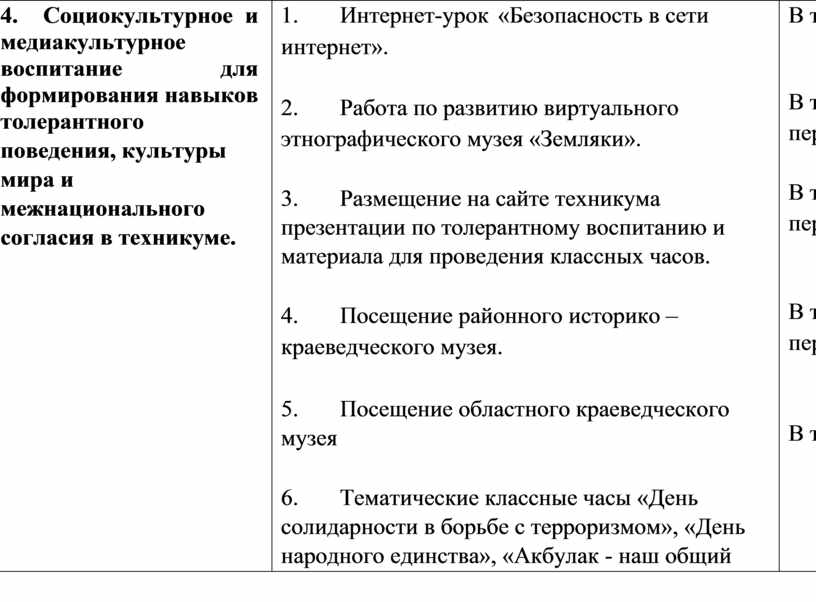 • 3.Социокультурное и медиакультурное воспитание для формирования навыков толерантного поведения, культуры мира и межнационального согласия в техникуме.