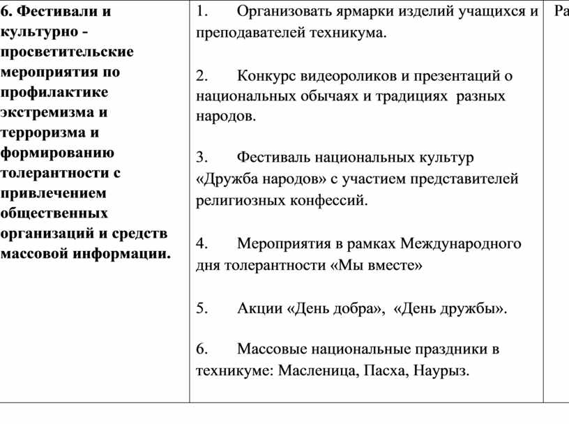 6. Фестивали и культурно - просветительские мероприятия по профилактике экстремизма и терроризма и формированию толерантности с привлечением общественных организаций и средств массовой информации. |