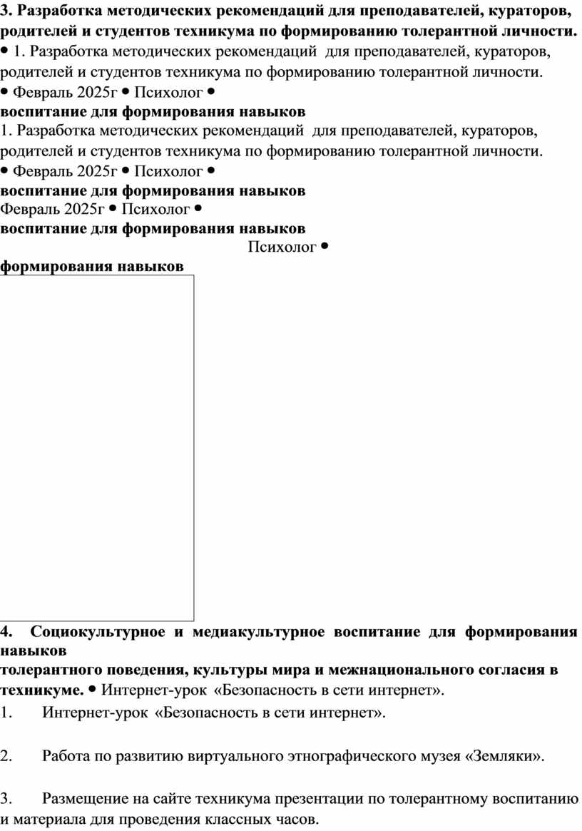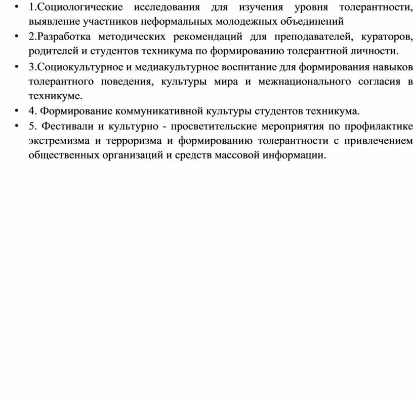 • Разработка методических рекомендаций для преподавателей, кураторов, родителей и студентов техникума по формированию толерантной личности.