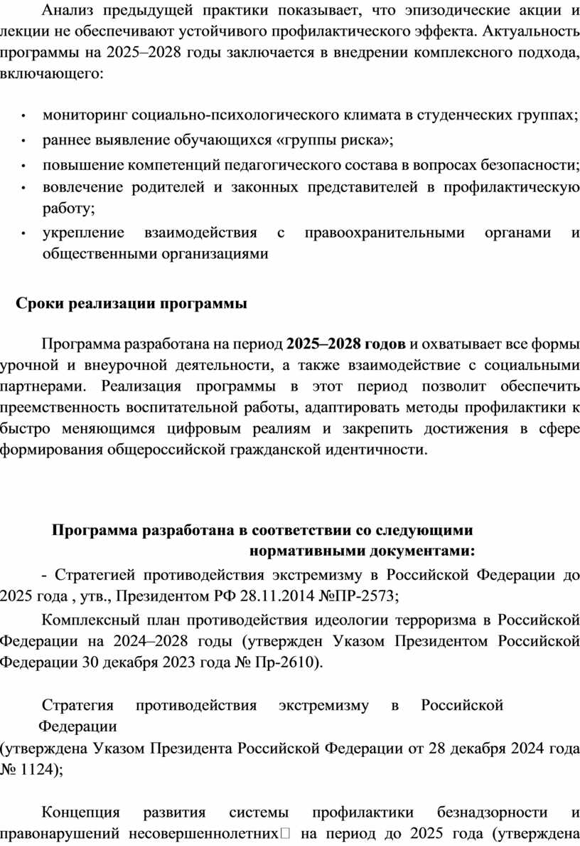 Программа разработана на период 2025–2028 годов и охватывает все формы урочной и внеурочной деятельности, а также взаимодействие с социальными партнерами. Реализация программы в этот период позволит обеспечить преемственность воспитательной работы, адаптировать методы профилактики к быстро меняющимся цифровым реалиям и закрепить достижения в сфере формирования общероссийской гражданской идентичности.