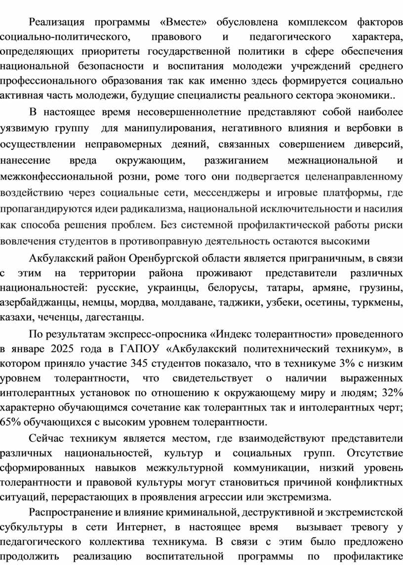 Программа «Вместе» актуальна в связи с потребностью перехода от разрозненных мероприятий к системной работе по формированию толерантной среды техникума, которая рассматривается не просто как отсутствие конфликтов, а как активная гражданская позиция, основанная на уважении к закону, человеку и многообразию культур России.