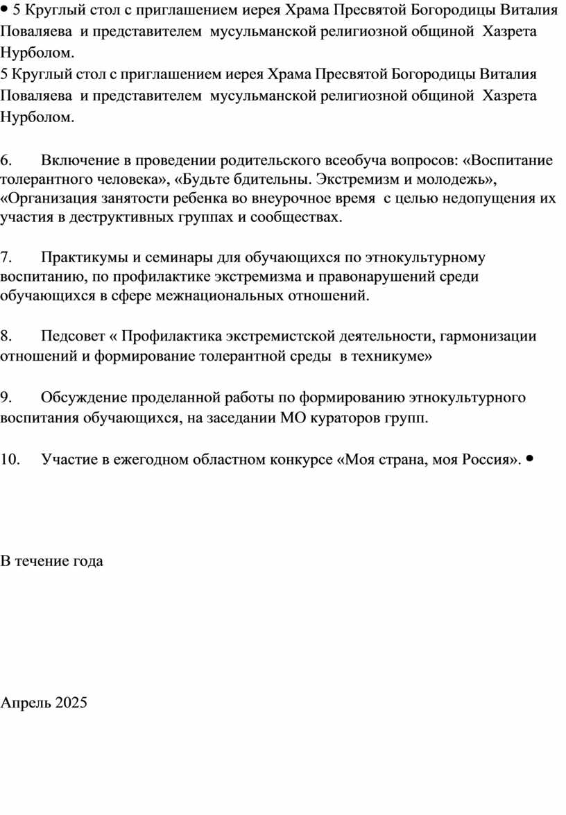 4.1. Мероприятия по реализации программы по профилактике экстремизма, терроризма и формированию толерантной среды техникума «Вместе» на 2025 –