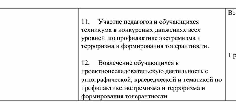 Распространение и влияние криминальной, деструктивной и экстремистской субкультуры в сети Интернет, в настоящее время вызывает тревогу у педагогического коллектива техникума. В связи с этим было предложено продолжить реализацию воспитательной программы по профилактике экстремизма и терроризма и формированию толерантности среди студентов техникума.