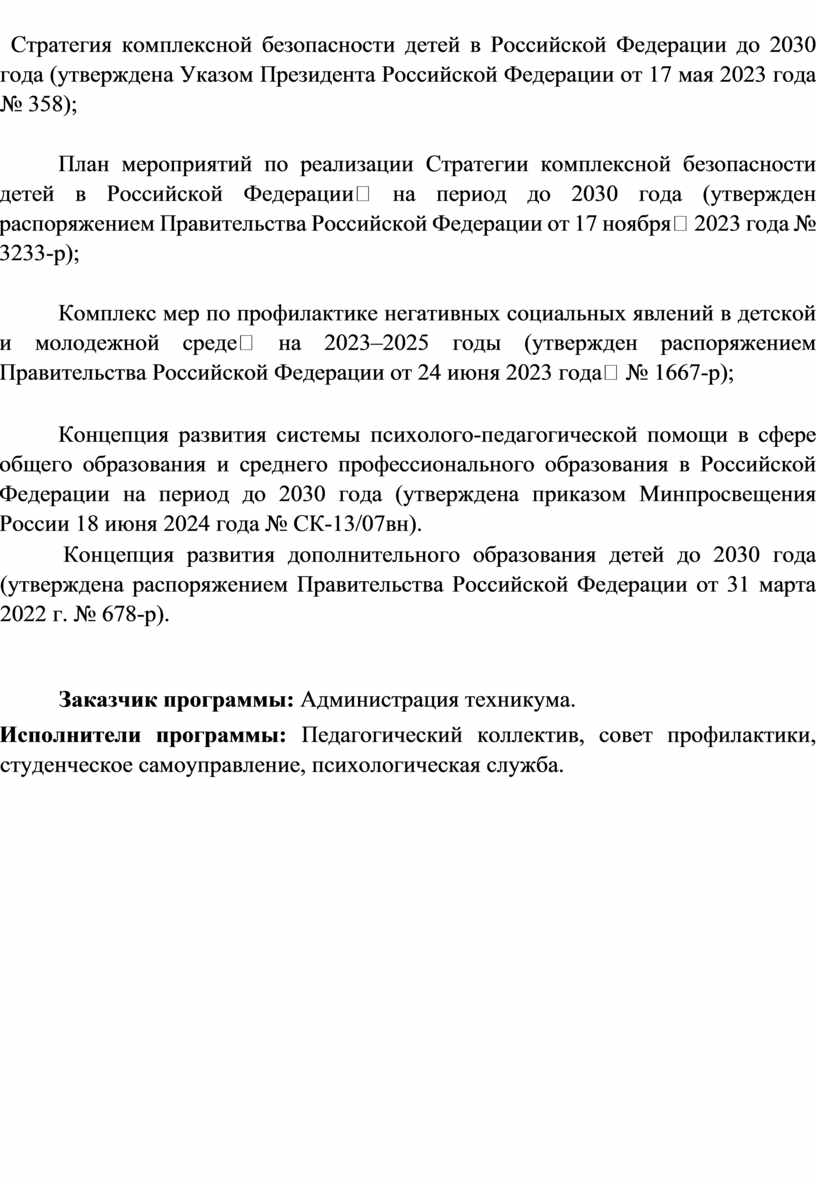 Стратегия комплексной безопасности детей в Российской Федерации до 2030 года (утверждена Указом Президента Российской Федерации от 17 мая 2023 года № 358);