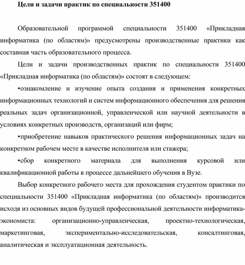 Выбор конкретного рабочего места для прохождения студентом практики по специальности 351400 «Прикладная информатика (по областям)» производится исходя из основных видов будущей профессиональной деятельности информатика-экономиста: организационно-управленческая, проектно-технологическая, маркетинговая, экспериментально-исследовательская, консалтинговая, аналитическая и эксплуатационная деятельность.