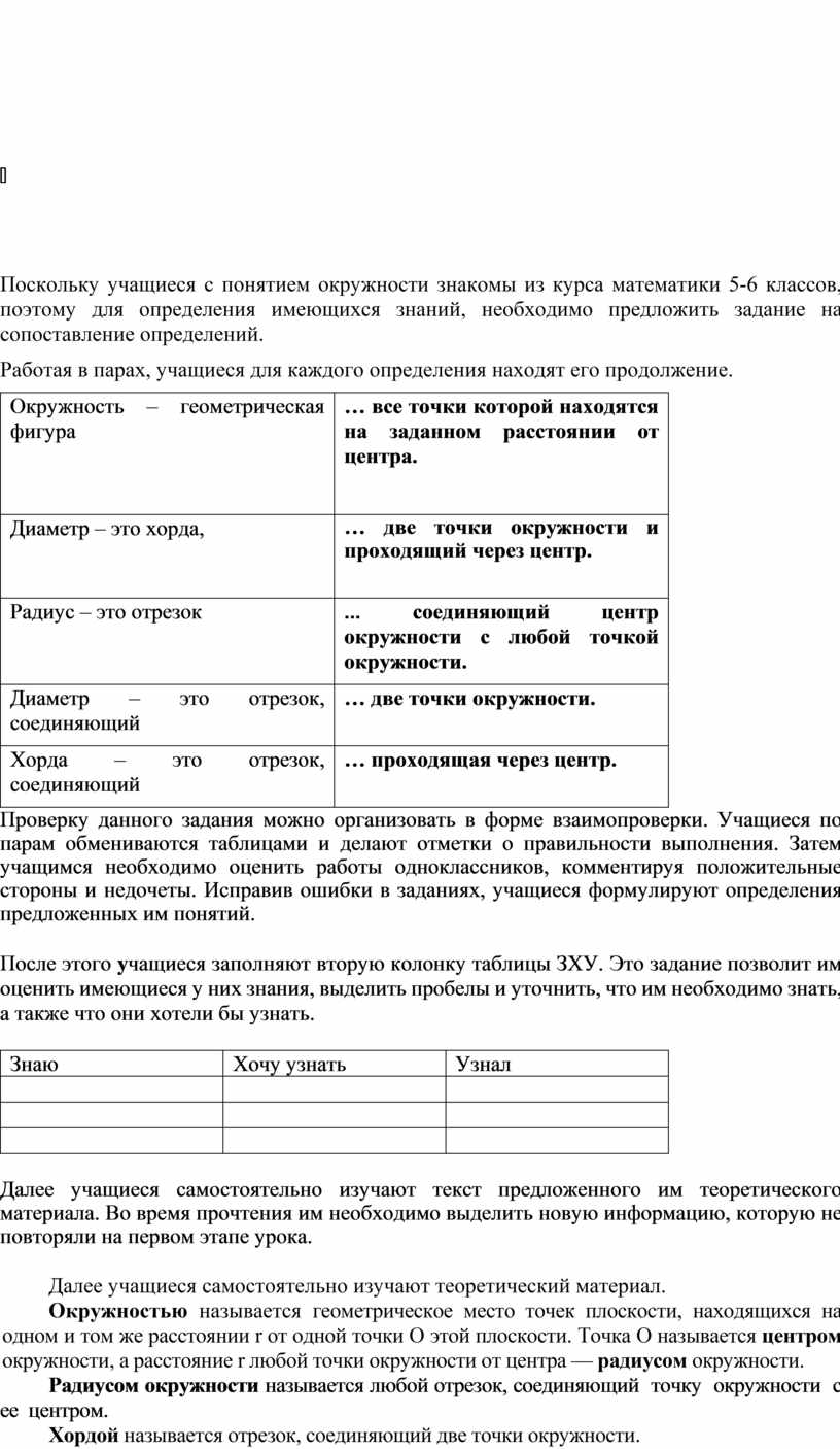 Поскольку учащиеся с понятием окружности знакомы из курса математики 5-6 классов, поэтому для определения имеющихся знаний, необходимо предложить задание на сопоставление определений. Работая в парах, учащиеся для каждого определения находят его продолжение.
