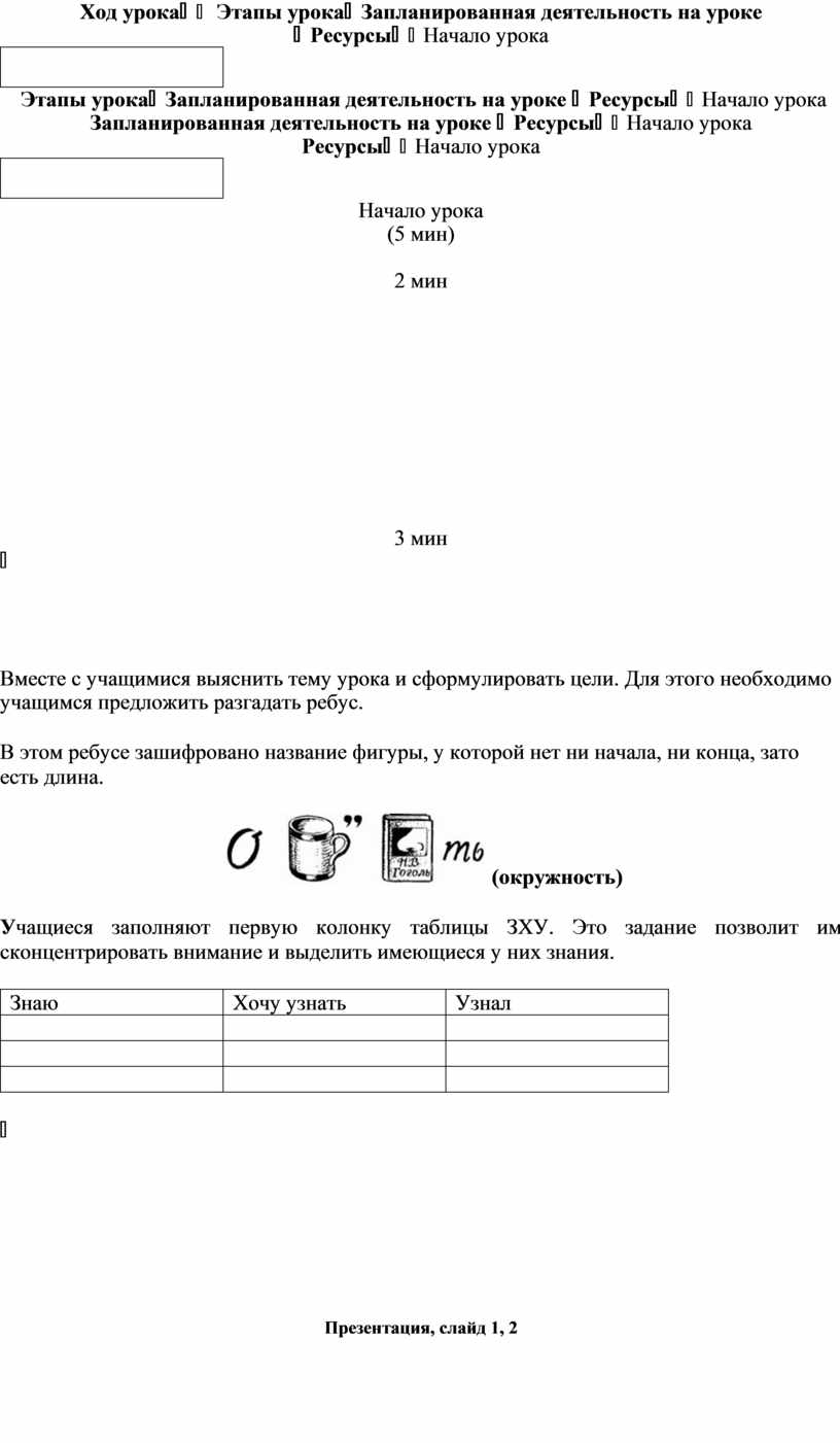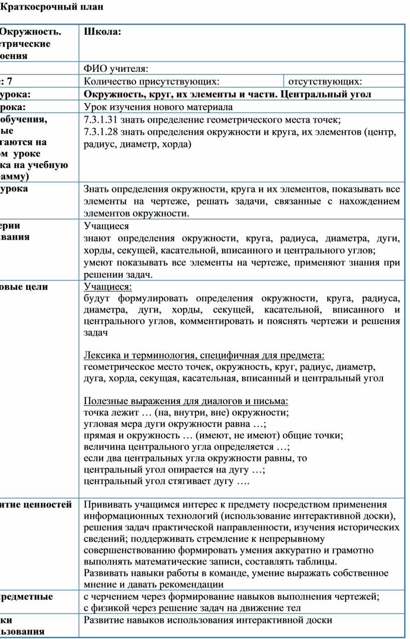 Лексика и терминология, специфичная для предмета: геометрическое место точек, окружность, круг, радиус, диаметр, дуга, хорда, секущая, касательная, вписанный и центральный угол