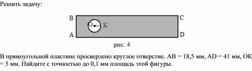 В прямоугольной пластине просверлено круглое отверстие. АВ = 18,5 мм, АD = 41 мм, ОК = 5 мм. Найдите с точностью до 0,1 мм площадь этой фигуры.