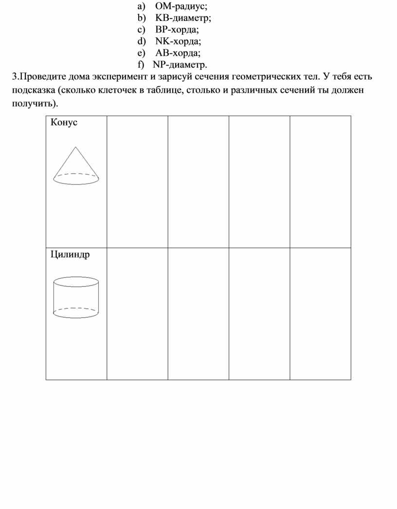 3.Проведите дома эксперимент и зарисуй сечения геометрических тел. У тебя есть подсказка (сколько клеточек в таблице, столько и различных сечений ты должен получить).
