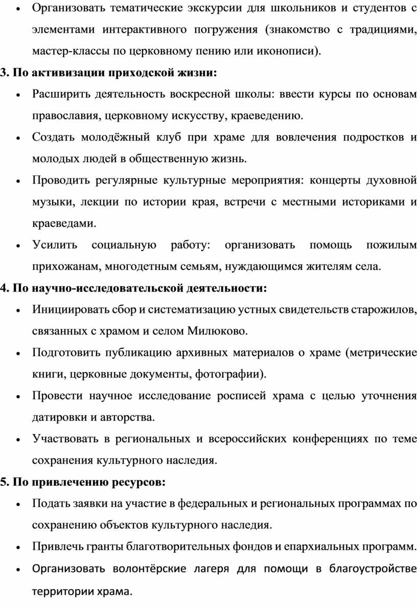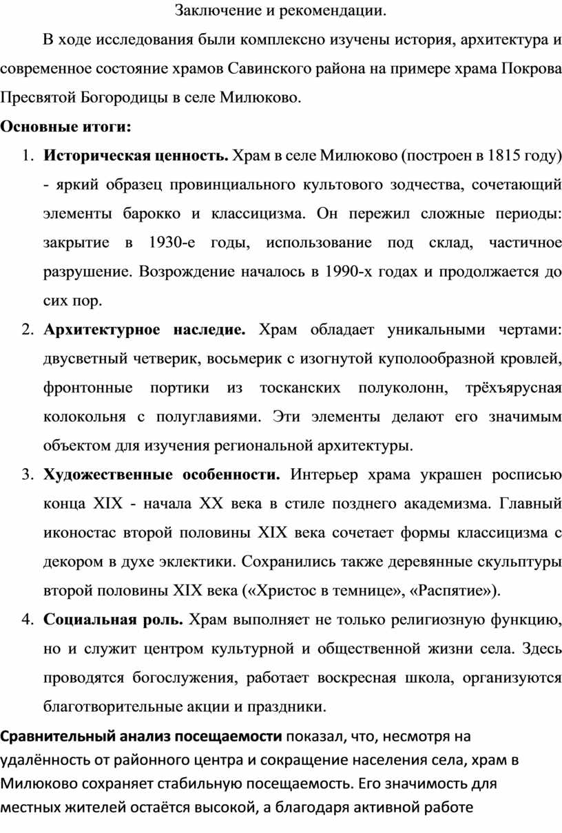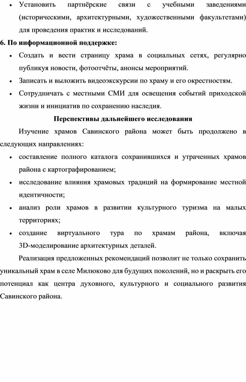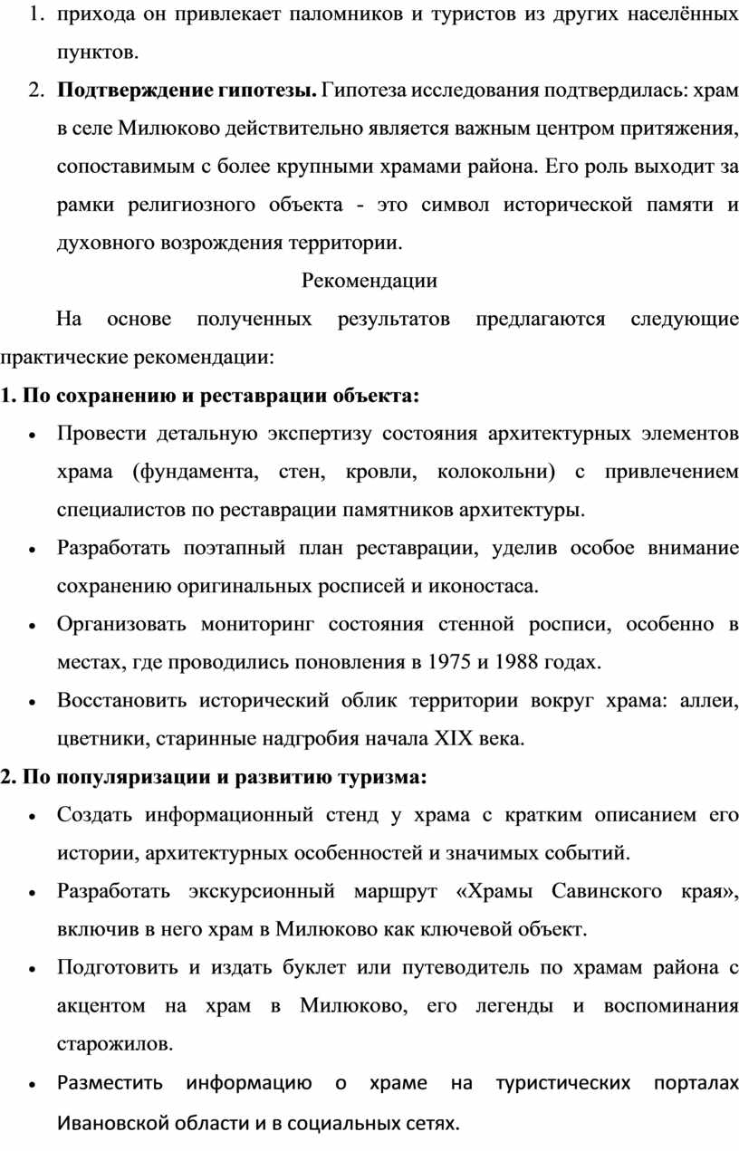 Реализация предложенных рекомендаций позволит не только сохранить уникальный храм в селе Милюково для будущих поколений, но и раскрыть его потенциал как центра духовного, культурного и социального развития Савинского района.