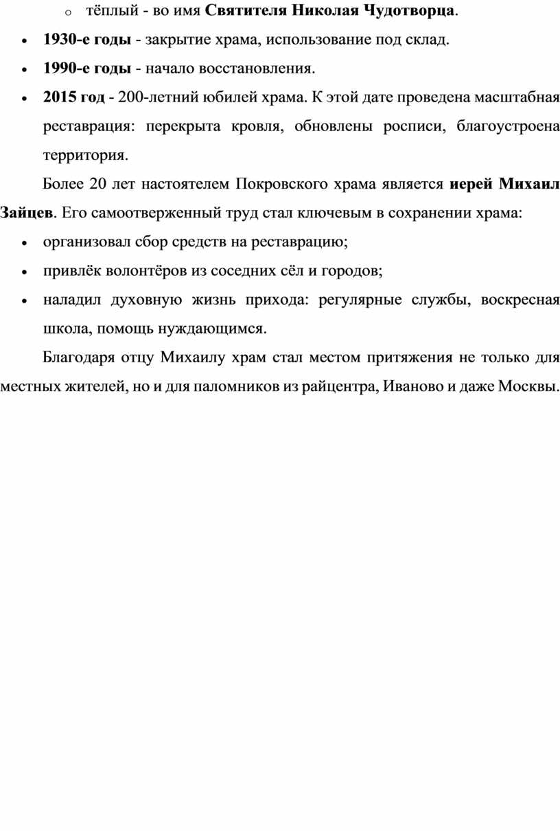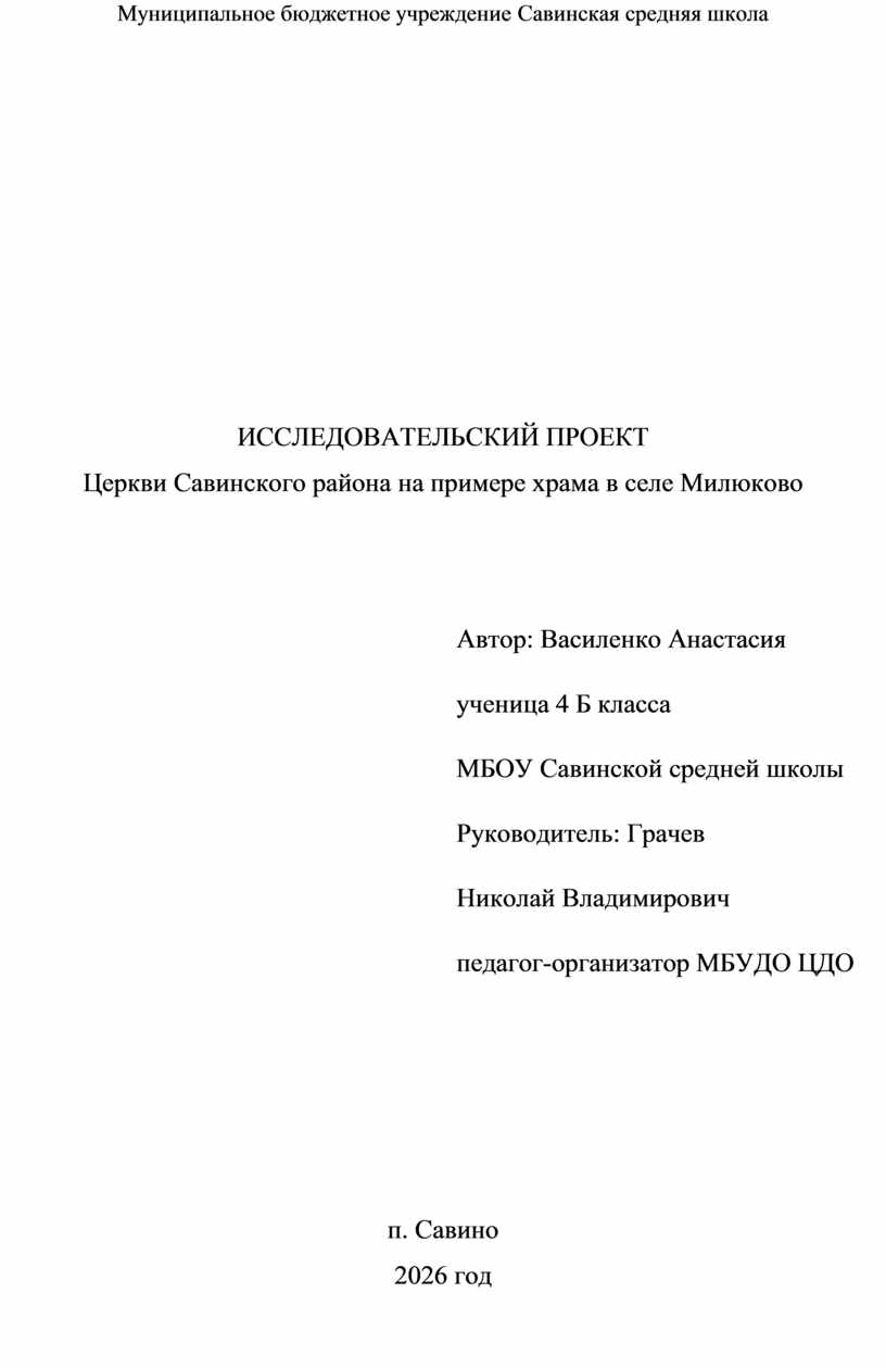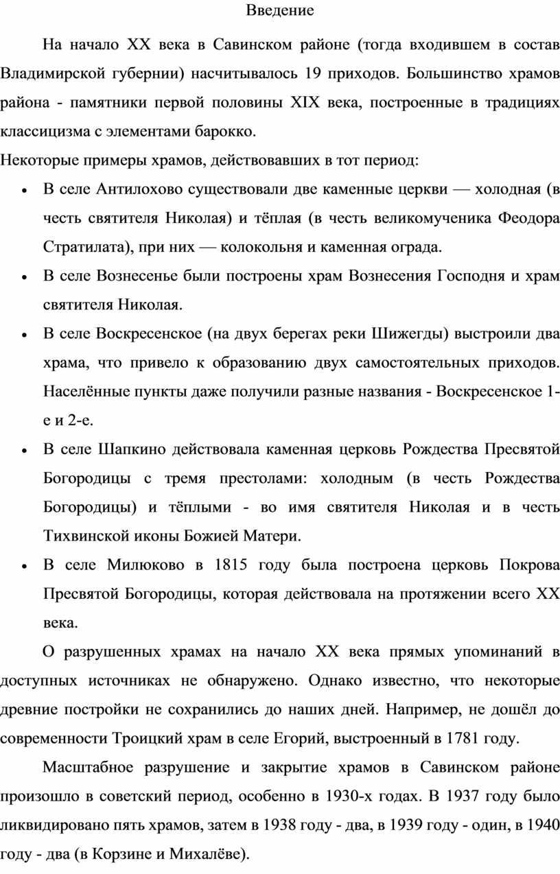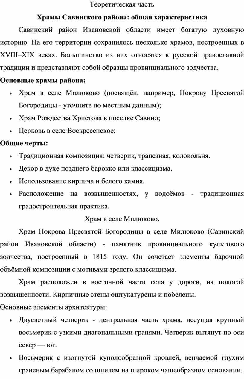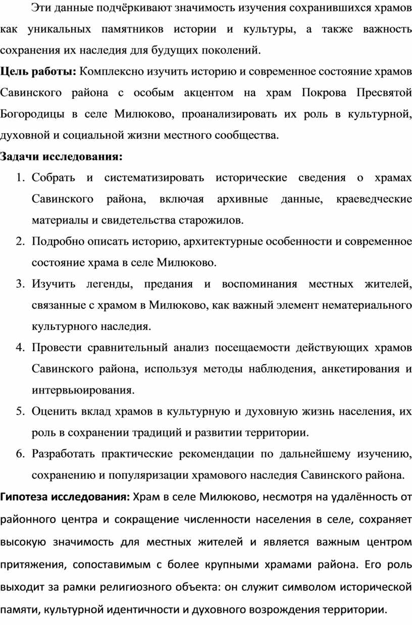 Цель работы: Комплексно изучить историю и современное состояние храмов Савинского района с особым акцентом на храм Покрова Пресвятой Богородицы в селе Милюково, проанализировать их роль в культурной, духовной и социальной жизни местного сообщества.