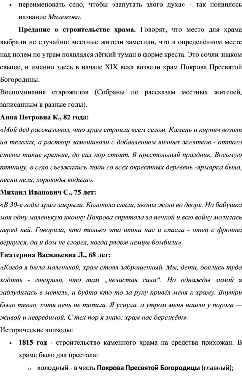 3. Изучить легенды, предания и воспоминания местных жителей, связанные с храмом в Милюково, как важный элемент нематериального культурного наследия.