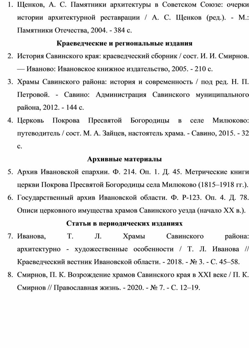 19. Смирнов, П. К. Возрождение храмов Савинского края в XXI веке / П. К. Смирнов // Православная жизнь. - 2020. - № 7. - С. 12–19.