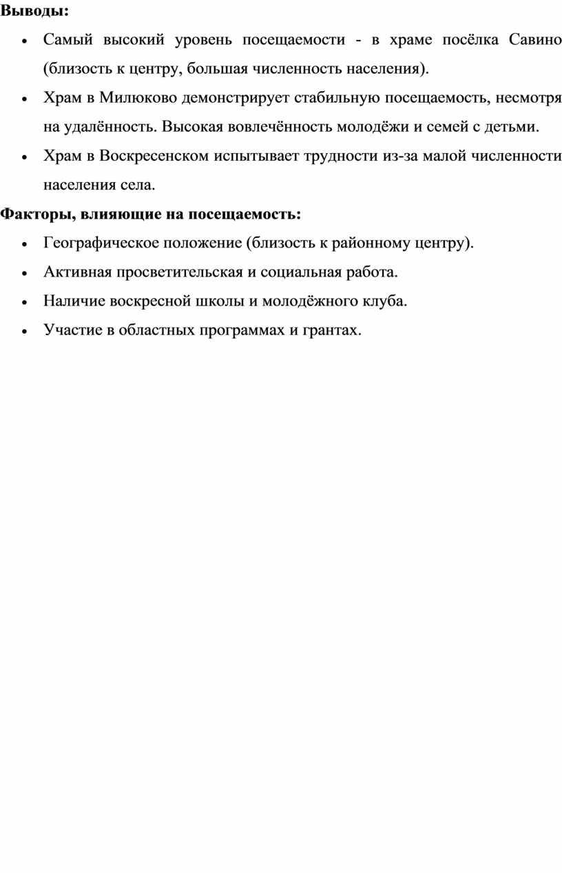 5. Сравнительный анализ посещаемости показал, что, несмотря на удалённость от районного центра и сокращение населения села, храм в Милюково сохраняет стабильную посещаемость. Его значимость для местных жителей остаётся высокой, а благодаря активной работе прихода он привлекает паломников и туристов из других населённых пунктов.