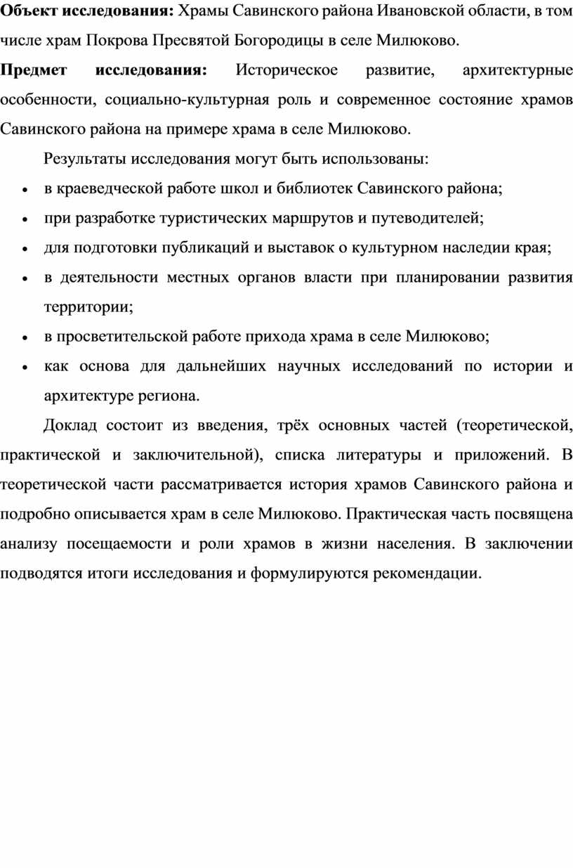 Предмет исследования: Историческое развитие, архитектурные особенности, социально‑культурная роль и современное состояние храмов Савинского района на примере храма в селе Милюково.