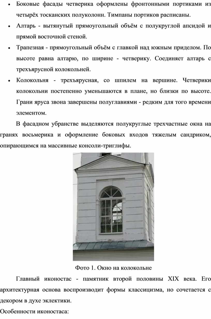 2. Архитектурное наследие. Храм обладает уникальными чертами: двусветный четверик, восьмерик с изогнутой куполообразной кровлей, фронтонные портики из тосканских полуколонн, трёхъярусная колокольня с полуглавиями. Эти элементы делают его значимым объектом для изучения региональной архитектуры.
