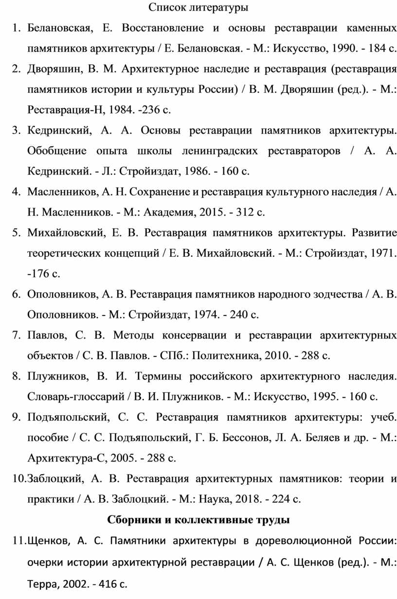 2. Дворяшин, В. М. Архитектурное наследие и реставрация (реставрация памятников истории и культуры России) / В. М. Дворяшин (ред.). - М.: Реставрация‑Н, 1984. -236 с.