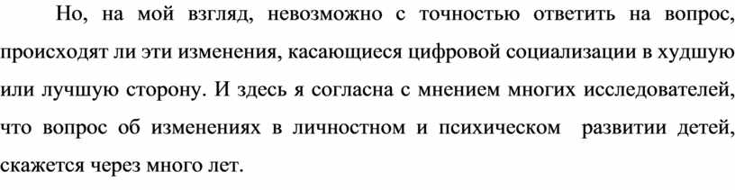 Но, на мой взгляд, невозможно с точностью ответить на вопрос, происходят ли эти изменения, касающиеся цифровой социализации в худшую или лучшую сторону. И здесь я согласна с мнением многих исследователей, что вопрос об изменениях в личностном и психическом развитии детей, скажется через много лет.