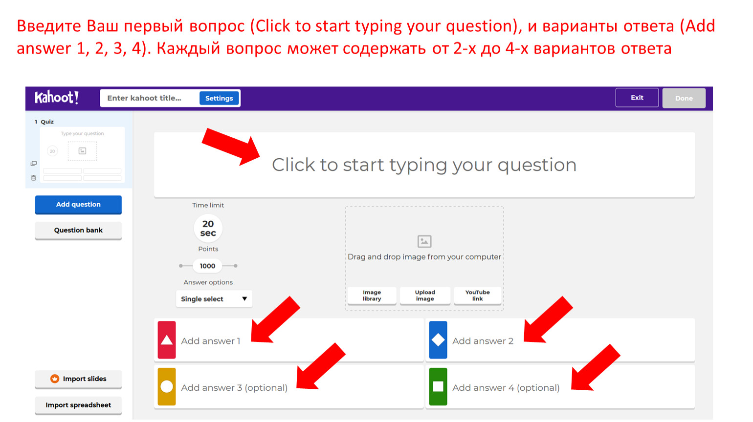 Введите Ваш первый вопрос (Click to start typing your question), и варианты ответа (Add answer 1, 2, 3, 4). Каждый вопрос может содержать от 2-х до 4-х вариантов ответа
