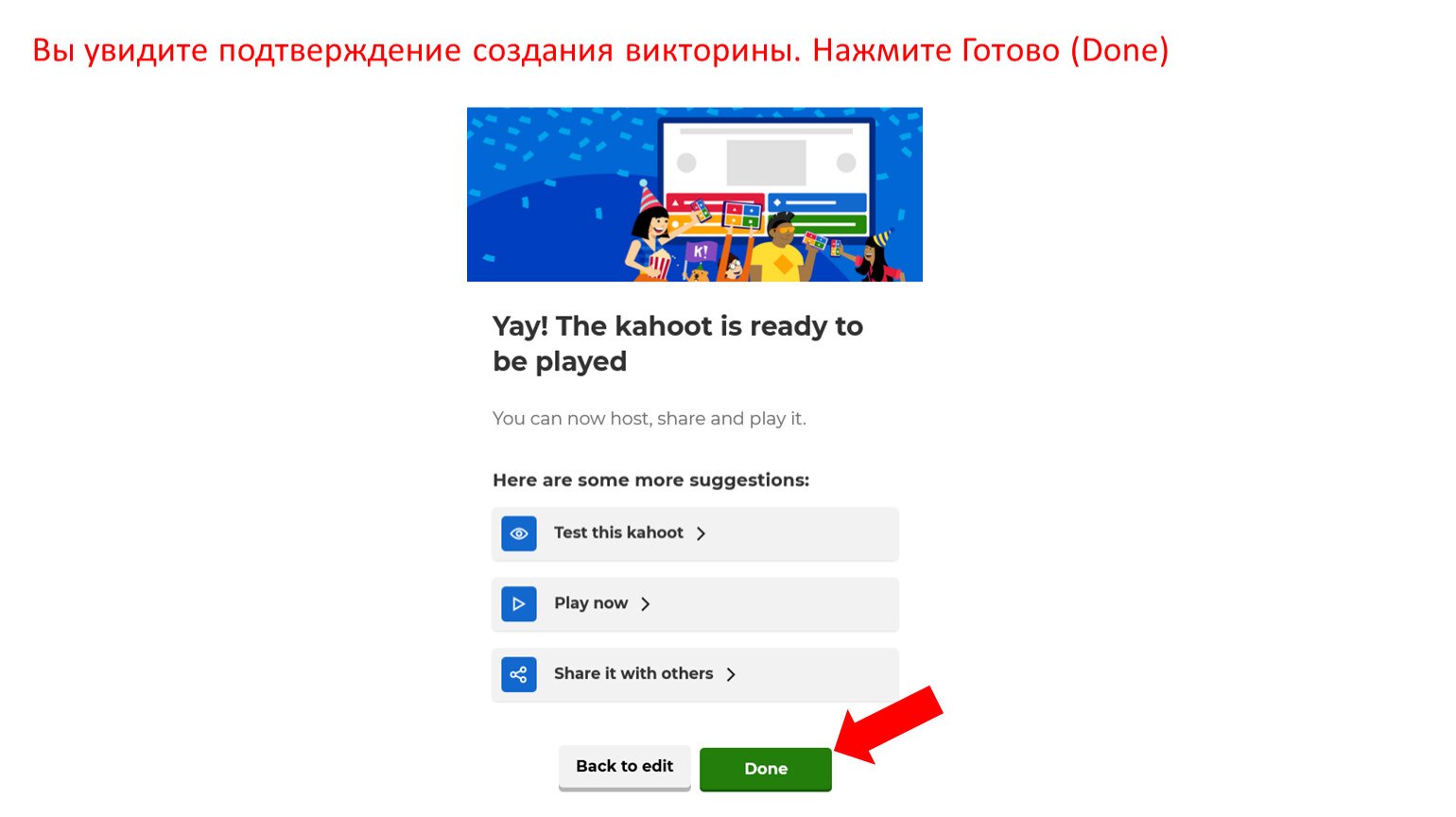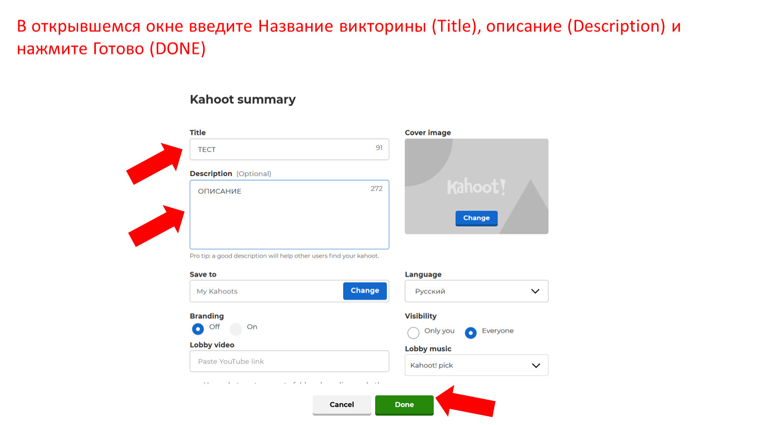 В открывшемся окне введите Название викторины (Title), описание (Description) и нажмите Готово (DONE)
