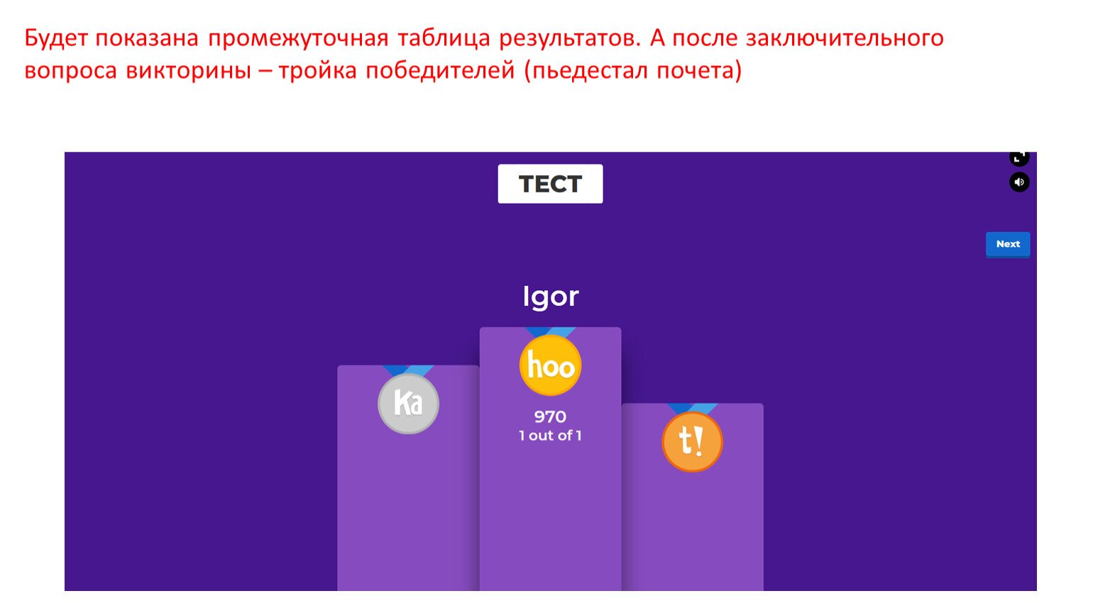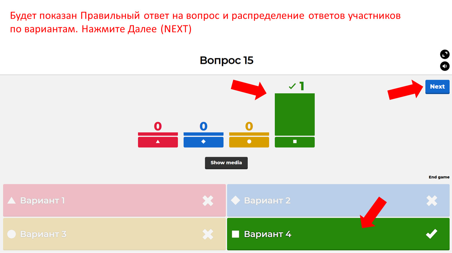 Будет показан Правильный ответ на вопрос и распределение ответов участников по вариантам. Нажмите Далее (NEXT)