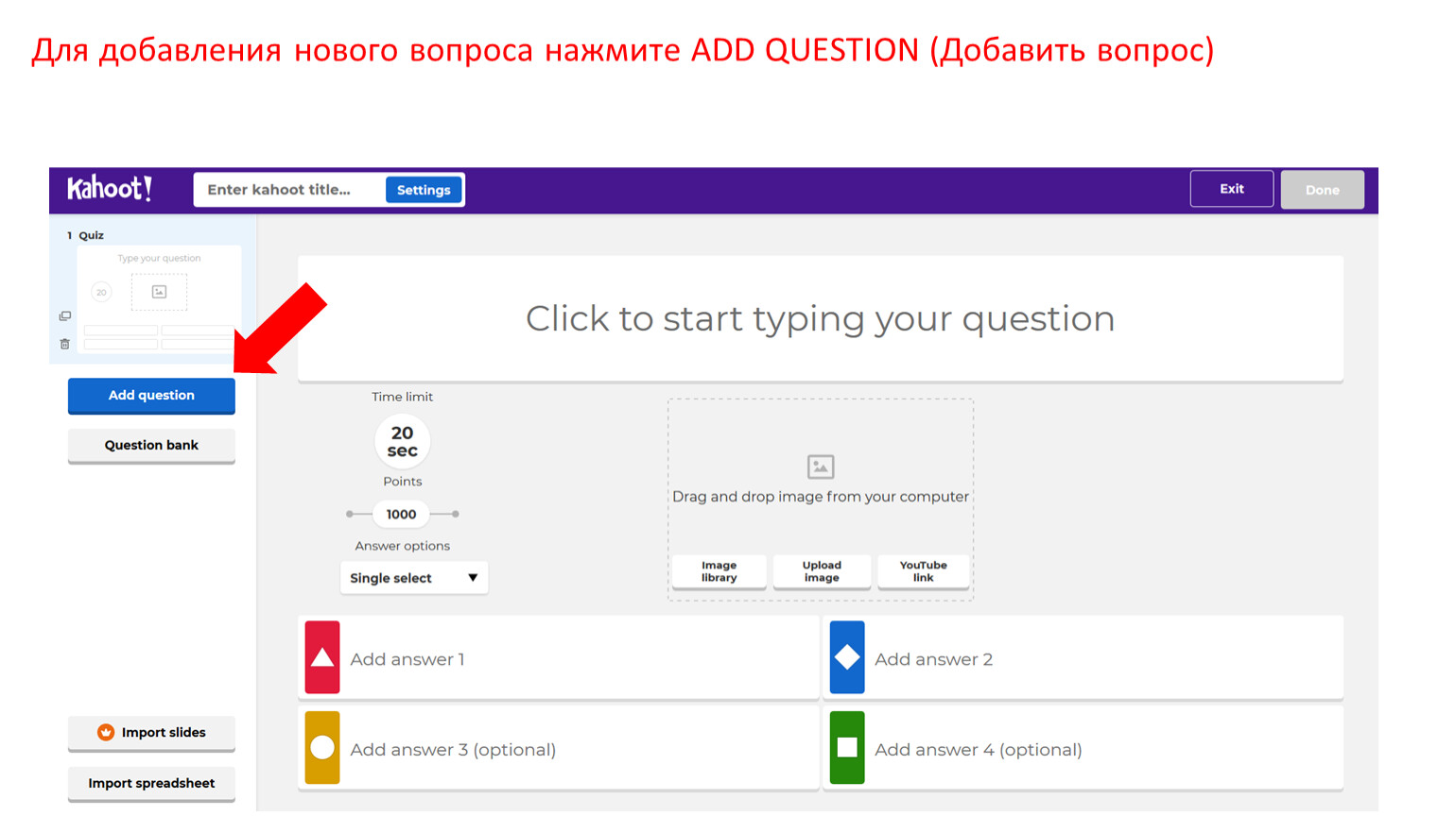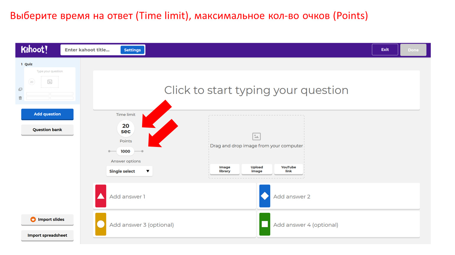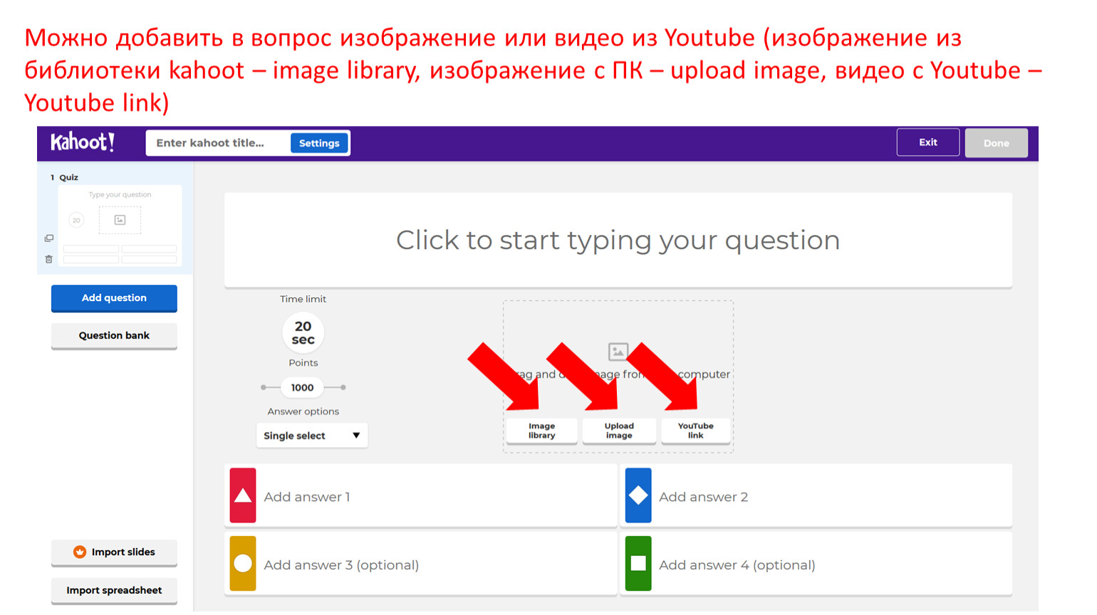 Можно добавить в вопрос изображение или видео из Youtube (изображение из библиотеки kahoot – image library, изображение с ПК – upload image, видео с Youtube – Youtube link)