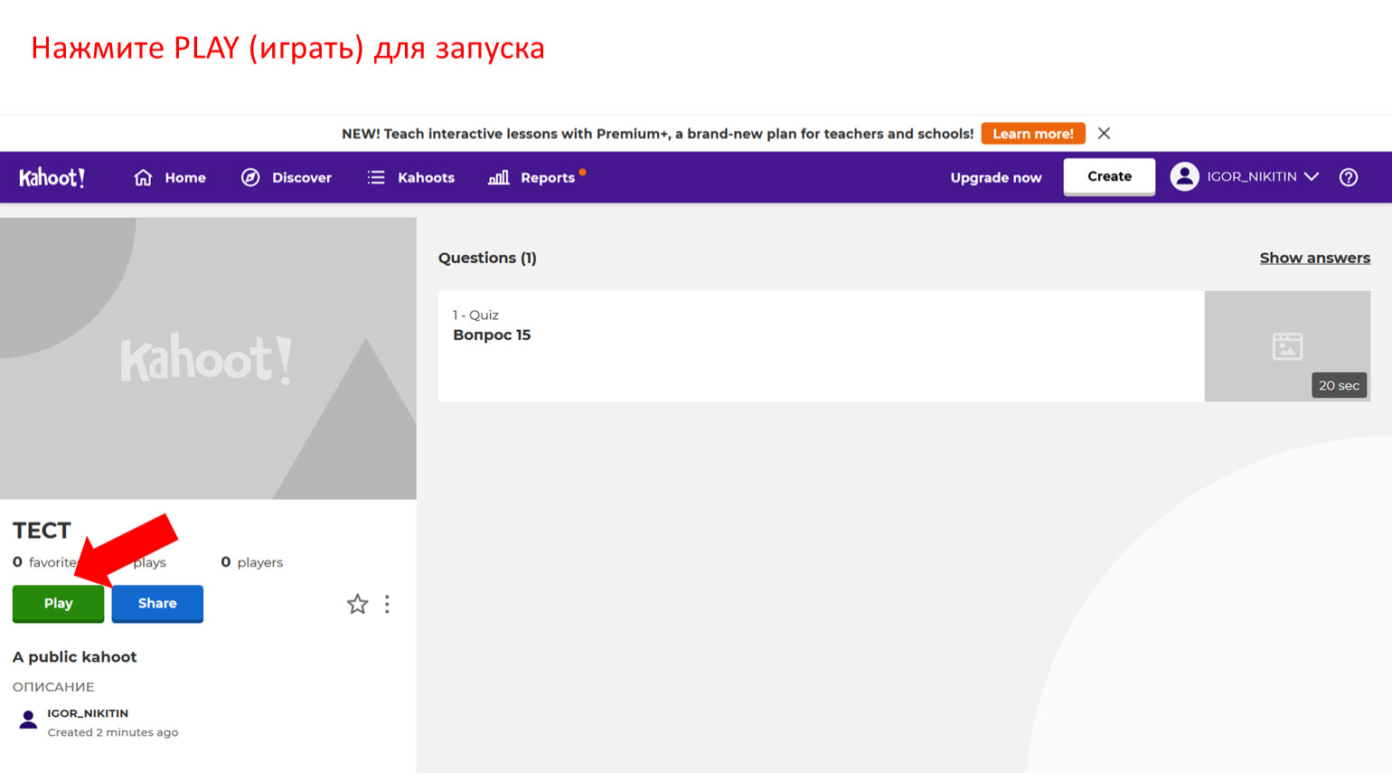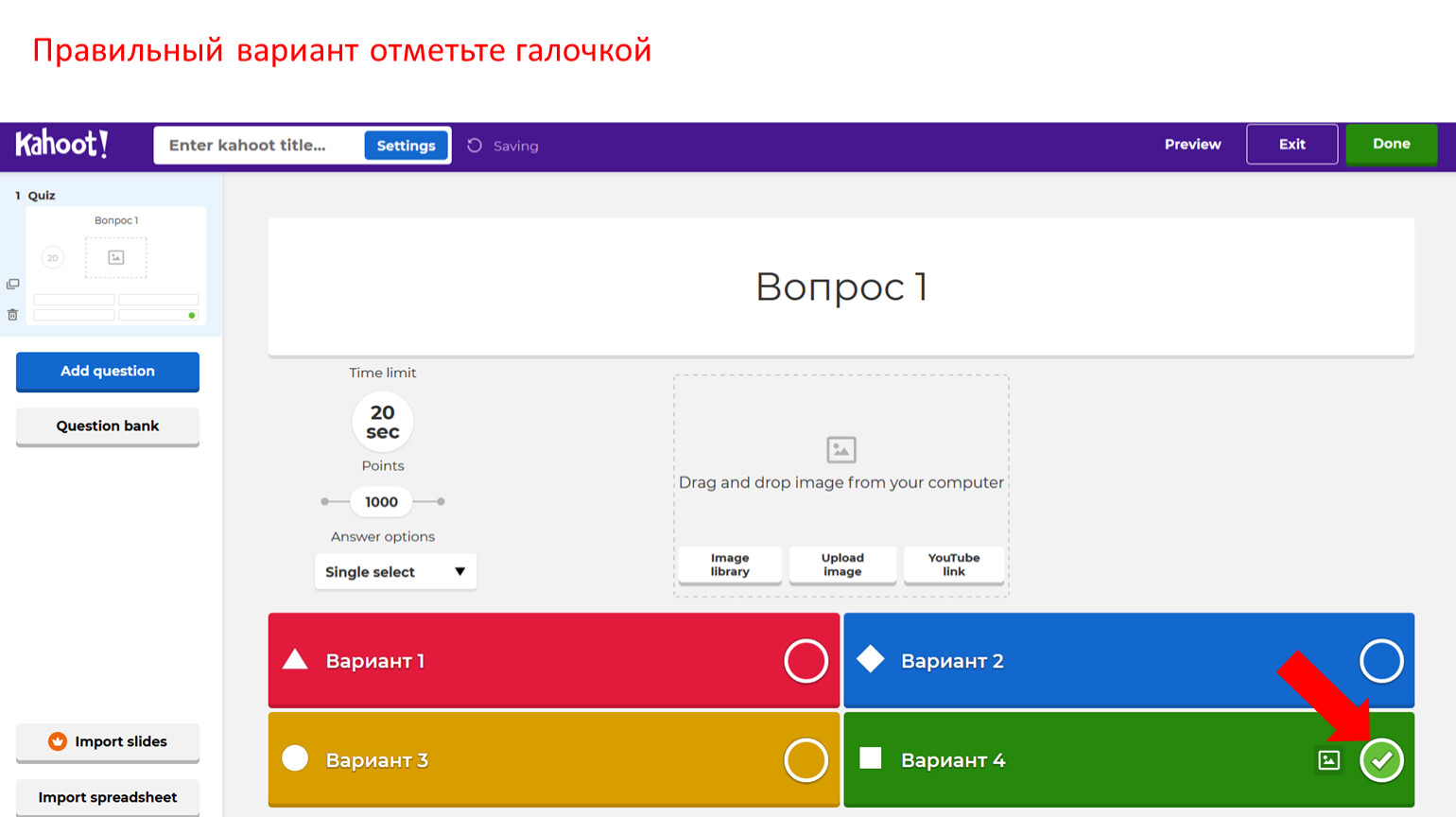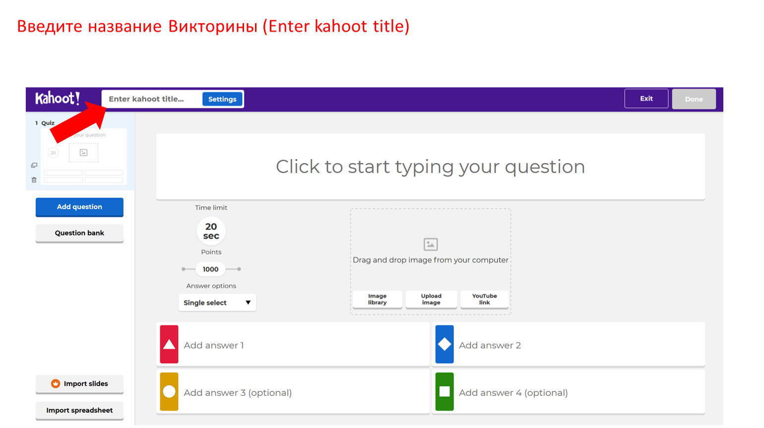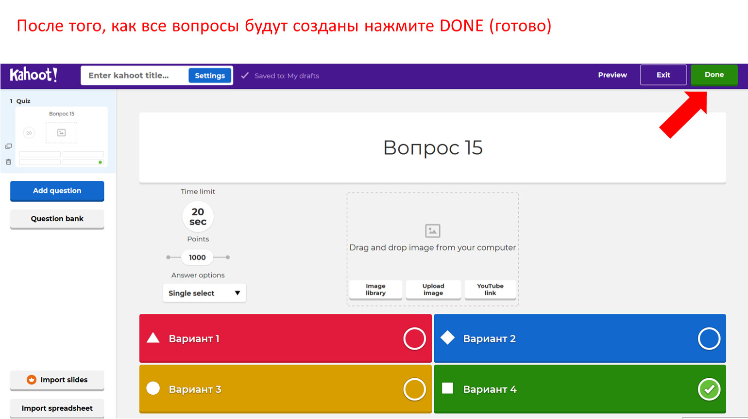 Можно добавить в вопрос изображение или видео из Youtube (изображение из библиотеки kahoot – image library, изображение с ПК – upload image, видео с Youtube – Youtube link)