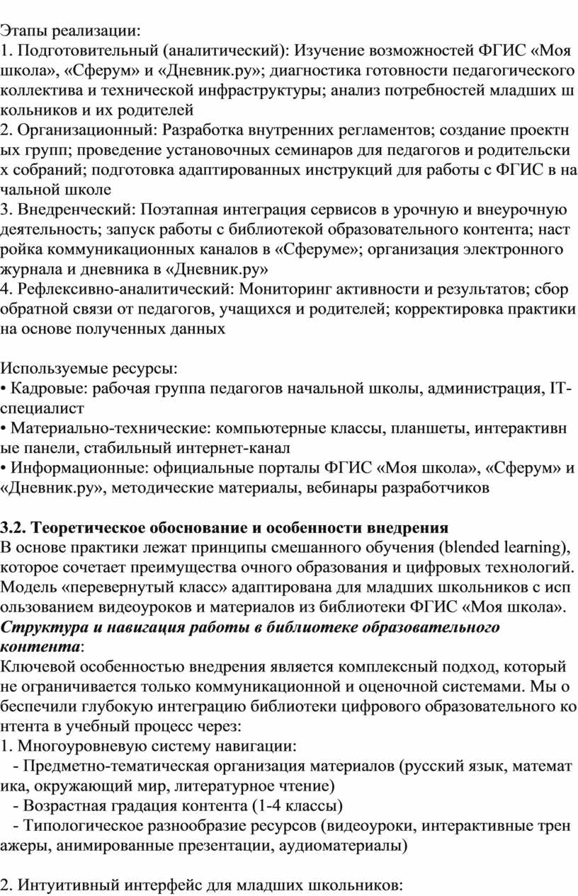 1. Подготовительный (аналитический): Изучение возможностей ФГИС «Моя школа», «Сферум» и «Дневник.ру»; диагностика готовности педагогического коллектива и технической инфраструктуры; анализ потребностей младших школьников и их родителей