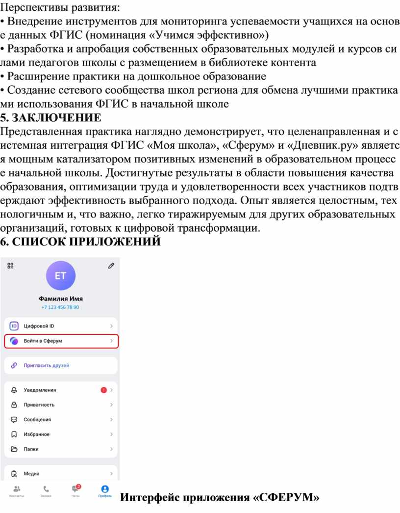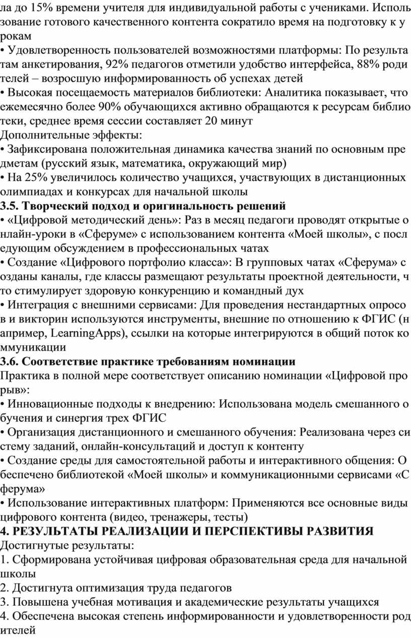 Представленная практика наглядно демонстрирует, что целенаправленная и системная интеграция ФГИС «Моя школа», «Сферум» и «Дневник.ру» является мощным катализатором позитивных изменений в образовательном процессе начальной школы. Достигнутые результаты в области повышения качества образования, оптимизации труда и удовлетворенности всех участников подтверждают эффективность выбранного подхода. Опыт является целостным, технологичным и, что важно, легко тиражируемым для других образовательных организаций, готовых к цифровой трансформации.