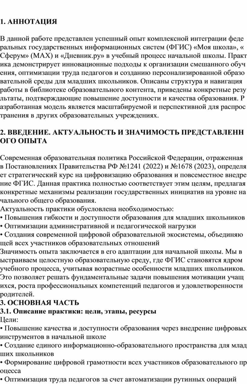 Современная образовательная политика Российской Федерации, отраженная в Постановлениях Правительства РФ №1241 (2022) и №1678 (2023), определяет стратегический курс на цифровизацию образования и повсеместное внедрение ФГИС. Данная практика полностью соответствует этим целям, предлагая конкретные механизмы реализации государственных инициатив на уровне начального общего образования.