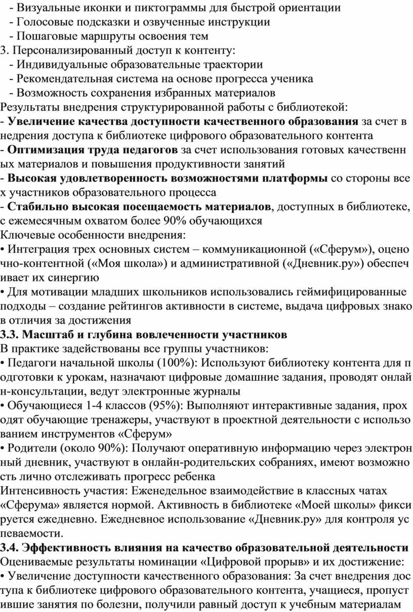 Ключевой особенностью внедрения является комплексный подход, который не ограничивается только коммуникационной и оценочной системами. Мы обеспечили глубокую интеграцию библиотеки цифрового образовательного контента в учебный процесс через:1. Многоуровневую систему навигации: - Предметно-тематическая организация материалов (русский язык, математика, окружающий мир, литературное чтение) - Возрастная градация контента (1-4 классы) - Типологическое разнообразие ресурсов (видеоуроки, интерактивные тренажеры, анимированные презентации, аудиоматериалы) 2. Интуитивный интерфейс для младших школьников: - Визуальные иконки и пиктограммы для быстрой ориентации - Голосовые подсказки и озвученные инструкции - Пошаговые маршруты освоения тем3. Персонализированный доступ к контенту: - Индивидуальные образовательные траектории - Рекомендательная система на основе прогресса ученика - Возможность сохранения избранных материаловРезультаты внедрения структурированной работы с библиотекой:- Увеличение качества доступности качественного образования за счет внедрения доступа к библиотеке цифрового образовательного контента- Оптимизация труда педагогов за счет использования готовых качественных материалов и повышения продуктивности занятий- Высокая удовлетворенность возможностями платформы со стороны всех участников образовательного процесса- Стабильно высокая посещаемость материалов, доступных в библиотеке, с ежемесячным охватом более 90% обучающихсяКлючевые особенности внедрения:• Интеграция трех основных систем – коммуникационной («Сферум»), оценочно-контентной («Моя школа») и административной («Дневник.ру») обеспечивает их синергию• Для мотивации младших школьников использовались геймифицированные подходы – создание рейтингов активности в системе, выдача цифровых знаков отличия за достижения