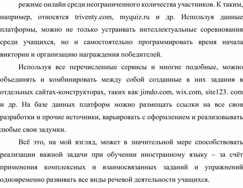 Используя все перечисленные сервисы и многие подобные, можно объединять и комбинировать между собой созданные в них задания в отдельных сайтах-конструкторах, таких как jimdo.com, wix.com, site123. com и др. На базе данных платформ можно размещать ссылки на все свои разработки и прочие источники, варьировать с оформлением и реализовывать любые свои задумки.