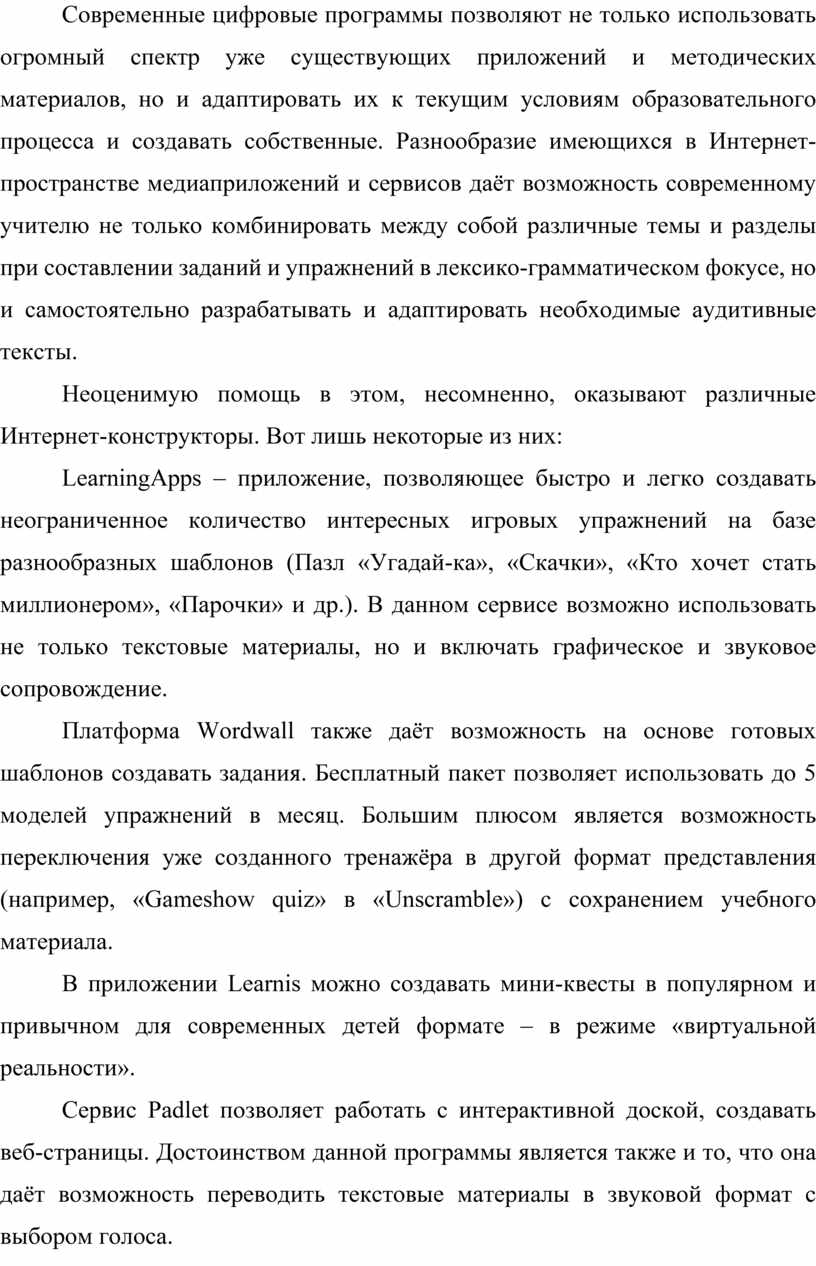 Современные цифровые программы позволяют не только использовать огромный спектр уже существующих приложений и методических материалов, но и адаптировать их к текущим условиям образовательного процесса и создавать собственные. Разнообразие имеющихся в Интернет-пространстве медиаприложений и сервисов даёт возможность современному учителю не только комбинировать между собой различные темы и разделы при составлении заданий и упражнений в лексико-грамматическом фокусе, но и самостоятельно разрабатывать и адаптировать необходимые аудитивные тексты.