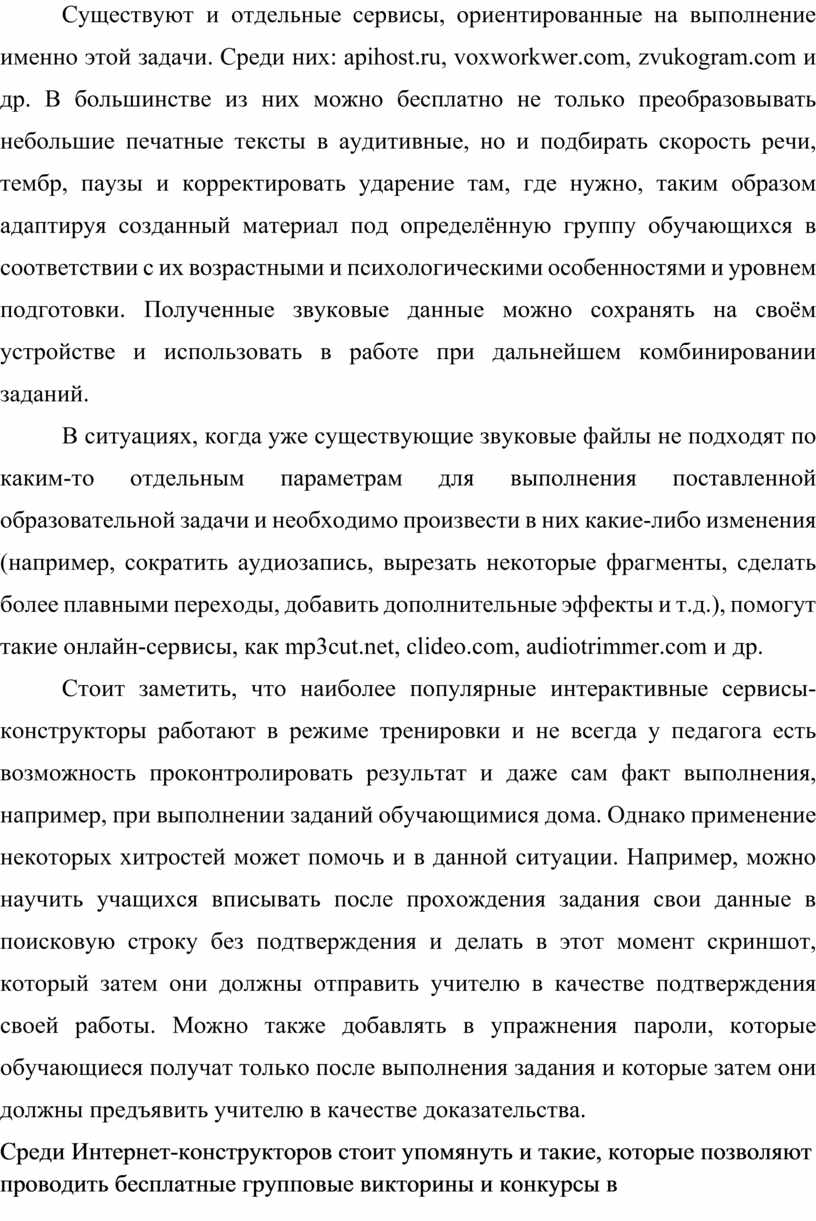 Существуют и отдельные сервисы, ориентированные на выполнение именно этой задачи. Среди них: apihost.ru, voxworkwer.com, zvukogram.com и др. В большинстве из них можно бесплатно не только преобразовывать небольшие печатные тексты в аудитивные, но и подбирать скорость речи, тембр, паузы и корректировать ударение там, где нужно, таким образом адаптируя созданный материал под определённую группу обучающихся в соответствии с их возрастными и психологическими особенностями и уровнем подготовки. Полученные звуковые данные можно сохранять на своём устройстве и использовать в работе при дальнейшем комбинировании заданий.