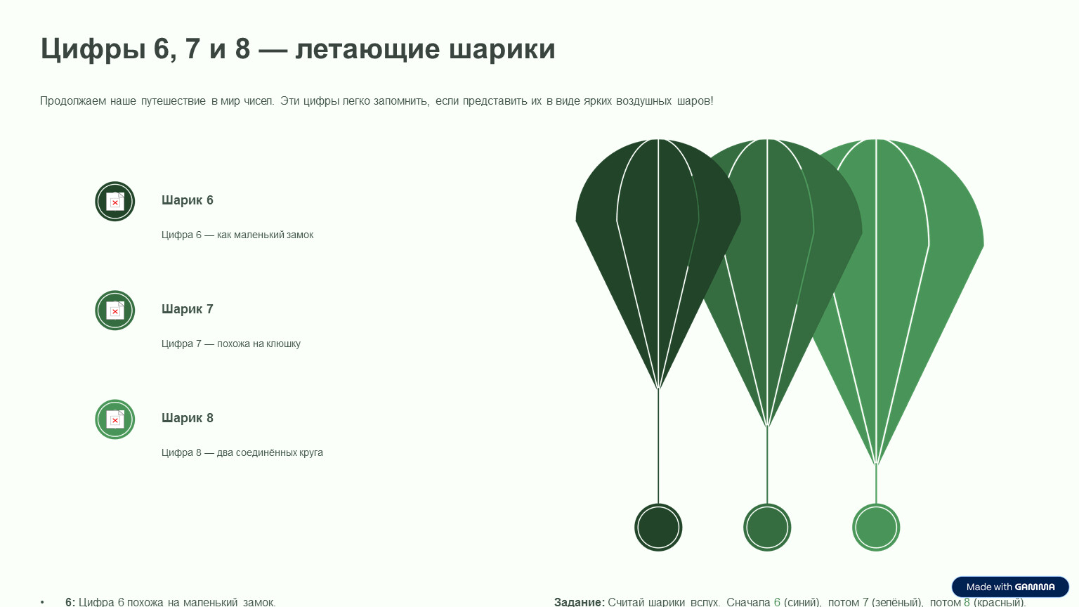 Задание: Считай шарики вслух. Сначала 6 (синий), потом 7 (зелёный), потом 8 (красный). Легко и весело!