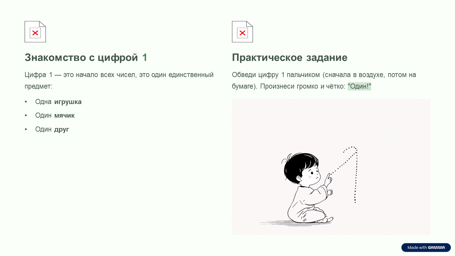 Обведи цифру 1 пальчиком (сначала в воздухе, потом на бумаге). Произнеси громко и чётко: "Один!"