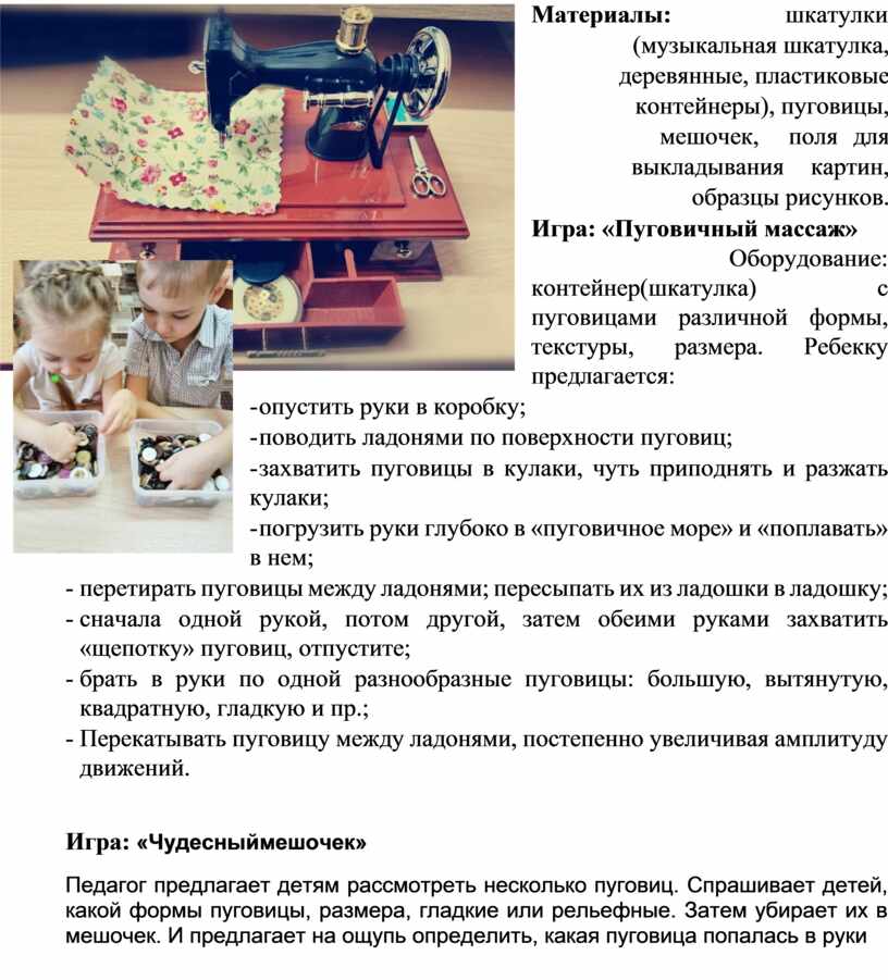 (музыкальная шкатулка, деревянные, пластиковые контейнеры), пуговицы, мешочек, поля для выкладывания картин, образцы рисунков.