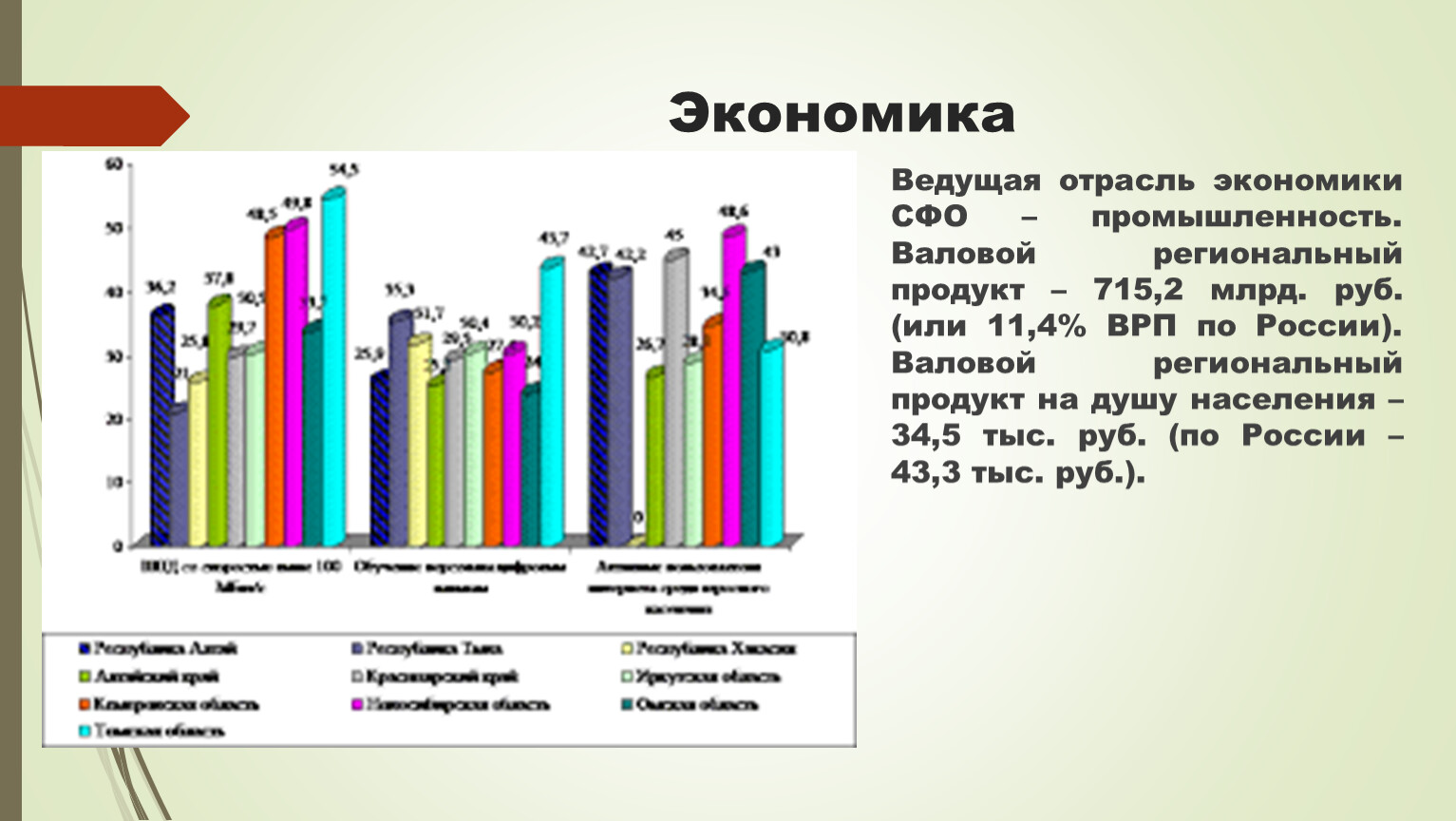 Ведущая отрасль экономики СФО – промышленность. Валовой региональный продукт – 715,2 млрд. руб. (или 11,4% ВРП по России). Валовой региональный продукт на душу населения – 34,5 тыс. руб. (по России – 43,3 тыс. руб.).