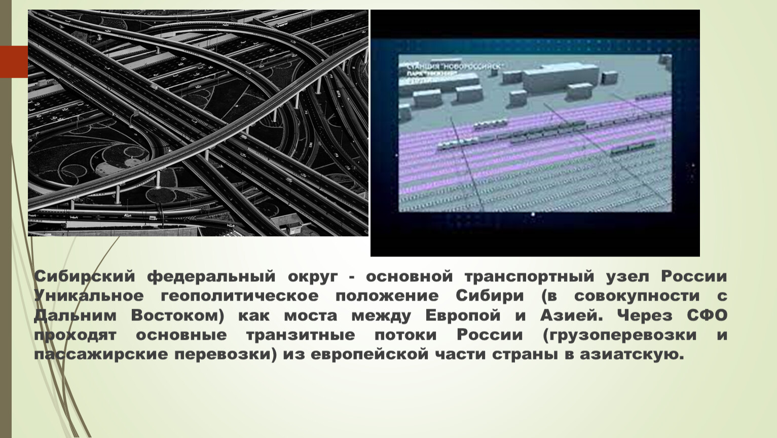 Сибирский федеральный округ - основной транспортный узел России Уникальное геополитическое положение Сибири (в совокупности с Дальним Востоком) как моста между Европой и Азией. Через СФО проходят основные транзитные потоки России (грузоперевозки и пассажирские перевозки) из европейской части страны в азиатскую.