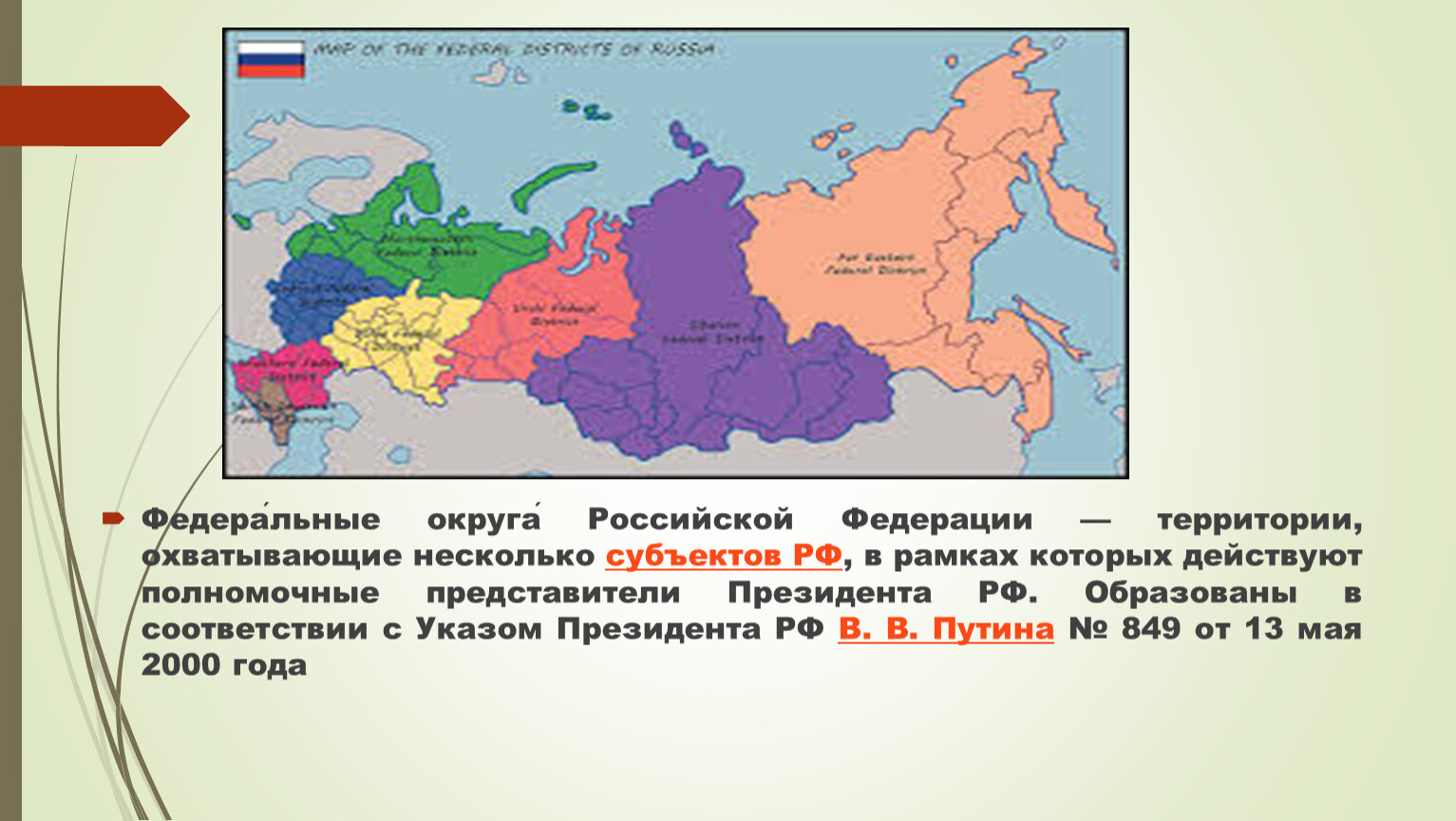 Федера́льные округа́ Российской Федерации — территории, охватывающие несколько субъектов РФ, в рамках которых действуют полномочные представители Президента РФ. Образованы в соответствии с Указом Президента РФ В. В. Путина № 849 от 13 мая 2000 года